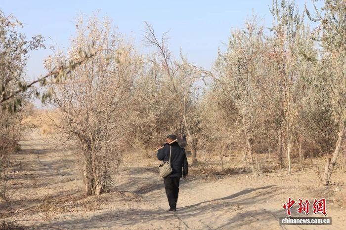 中新網(wǎng)新疆麥蓋提11月27日電 (任鵬程 陳文軍 艾斯凱爾·賽麥提)冬日的塔克拉瑪干沙漠透著刺骨寒意。近日,在新疆麥蓋提縣沙海林場(chǎng)的林間小道上,護(hù)林員阿布都莫明·衣明一大早便開(kāi)始了一天的巡護(hù)工作。