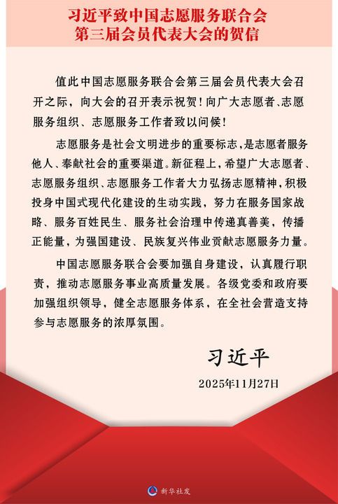 中國(guó)志愿服務(wù)聯(lián)合會(huì)第三屆會(huì)員代表大會(huì)27日至28日在京召開(kāi),會(huì)上宣讀了習(xí)近平的賀信。