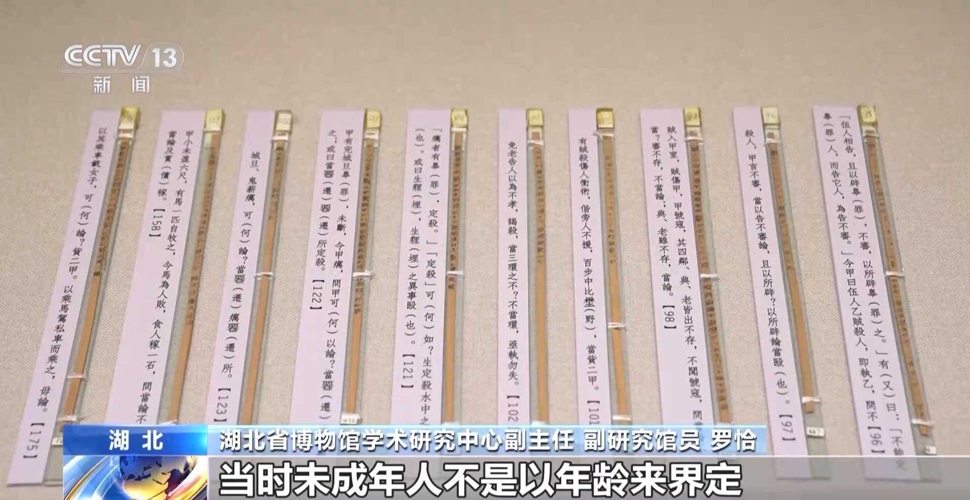 湖北省博物館學(xué)術(shù)研究中心副主任 副研究館員 羅?。哼@一組就是睡虎地秦簡里面的《法律答問》,這里面就有目前我們發(fā)現(xiàn)的最早的“未成年人保護(hù)法”。當(dāng)時(shí)未成年人不是以年齡來界定,他是以身高6尺(來界定),大概相當(dāng)于現(xiàn)在不到1米39的樣子,6尺以下是未成年人。這里面講不到6尺的一個(gè)小孩去放馬,馬受到了驚擾,就吃掉了人家一石的莊稼。那么現(xiàn)在就問——這個(gè)小孩該不該受到懲處,回答是不該受到懲處,而且也不用去賠償莊稼,這也是當(dāng)時(shí)對未成年人進(jìn)行一個(gè)特殊照顧(的體現(xiàn))。