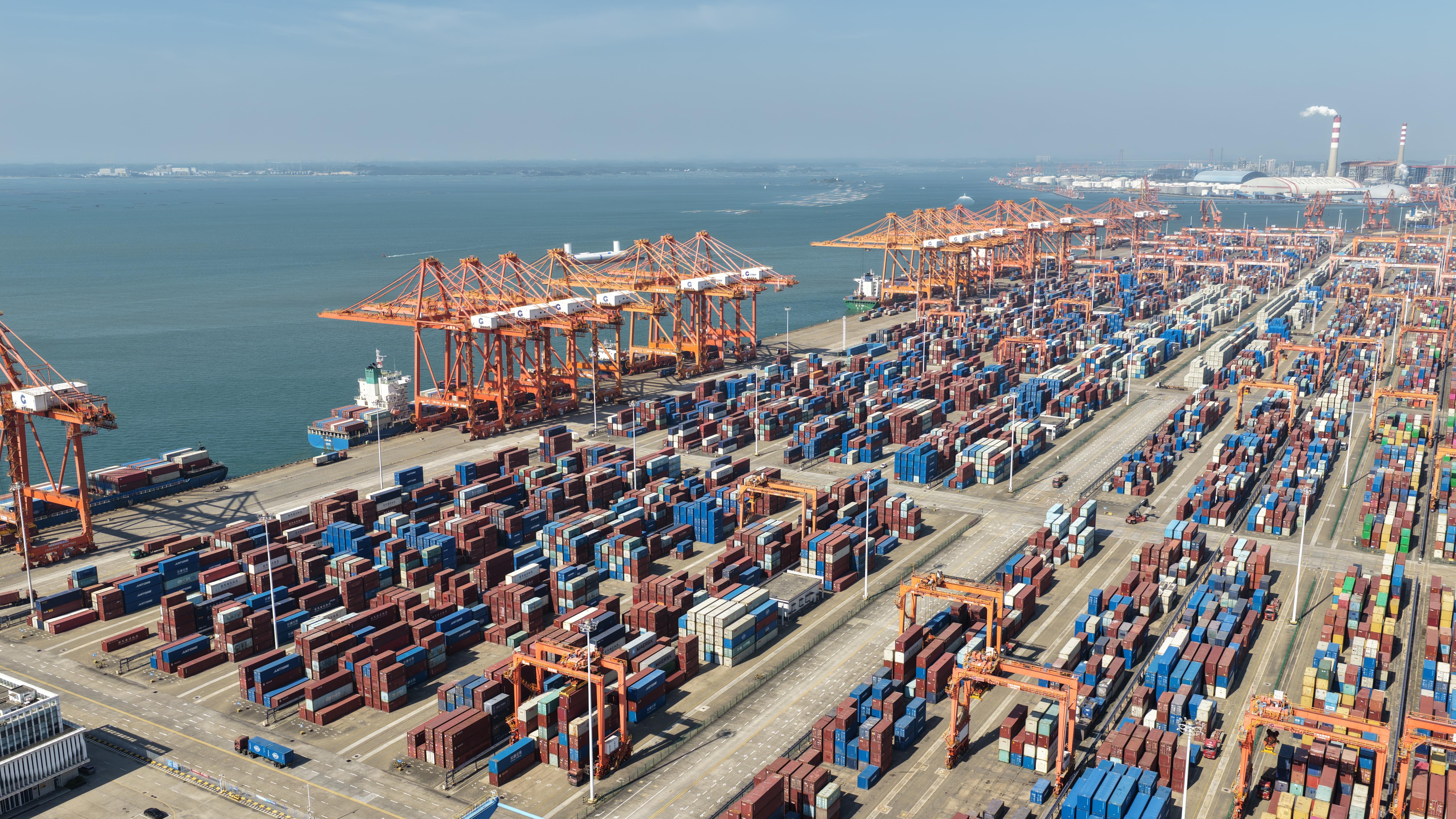 11月29日,廣西北部灣港欽州自動化碼頭集裝箱有序堆疊擺放。(何家海 攝)