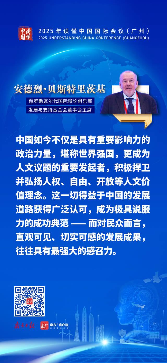 12月1日上午,2025年“讀懂中國(guó)”國(guó)際會(huì)議開(kāi)幕式在廣州舉行。在大會(huì)演講環(huán)節(jié),俄羅斯瓦爾代國(guó)際辯論俱樂(lè)部發(fā)展與支持基金會(huì)董事會(huì)主席安德烈·貝斯特里茨基表示,中國(guó)式現(xiàn)代化的一個(gè)關(guān)鍵特征,是其已崛起為具有關(guān)鍵影響力的全球性大國(guó)。國(guó)內(nèi)發(fā)展所取得的卓越成就,為其拓展國(guó)際影響力鋪平了道路,使中國(guó)得以憑借自身的行動(dòng)議程與獨(dú)特發(fā)展模式,為推動(dòng)人類共同發(fā)展發(fā)揮建設(shè)性作用。