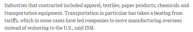 文章指出,美國制造業(yè)活動(dòng)萎縮的行業(yè)主要包括服裝、紡織品、紙制品、化工產(chǎn)品和運(yùn)輸業(yè)。文章表示,雖然當(dāng)前美國工廠產(chǎn)量有所增加,但未售出的庫存卻急劇增加。需求增長放緩,這在出口市場體現(xiàn)尤為明顯,而受關(guān)稅影響,出口市場的前景更加暗淡。