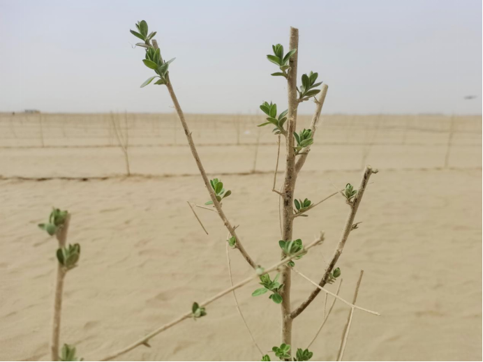 2025年4月,和田縣阿和公路西側(cè)群眾治沙點(diǎn)位的大果沙棗冒出新芽。馬雯萱 攝