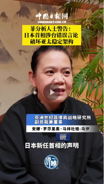 中國日報(bào)網(wǎng)12月4日電(記者 潘一僑) 針對日本新任首相高市早苗近期就臺灣問題發(fā)表的一系列錯誤言論,亞洲世紀(jì)菲律賓戰(zhàn)略研究所副總裁安娜·馬林杜格-烏伊接受中國日報(bào)的專訪。