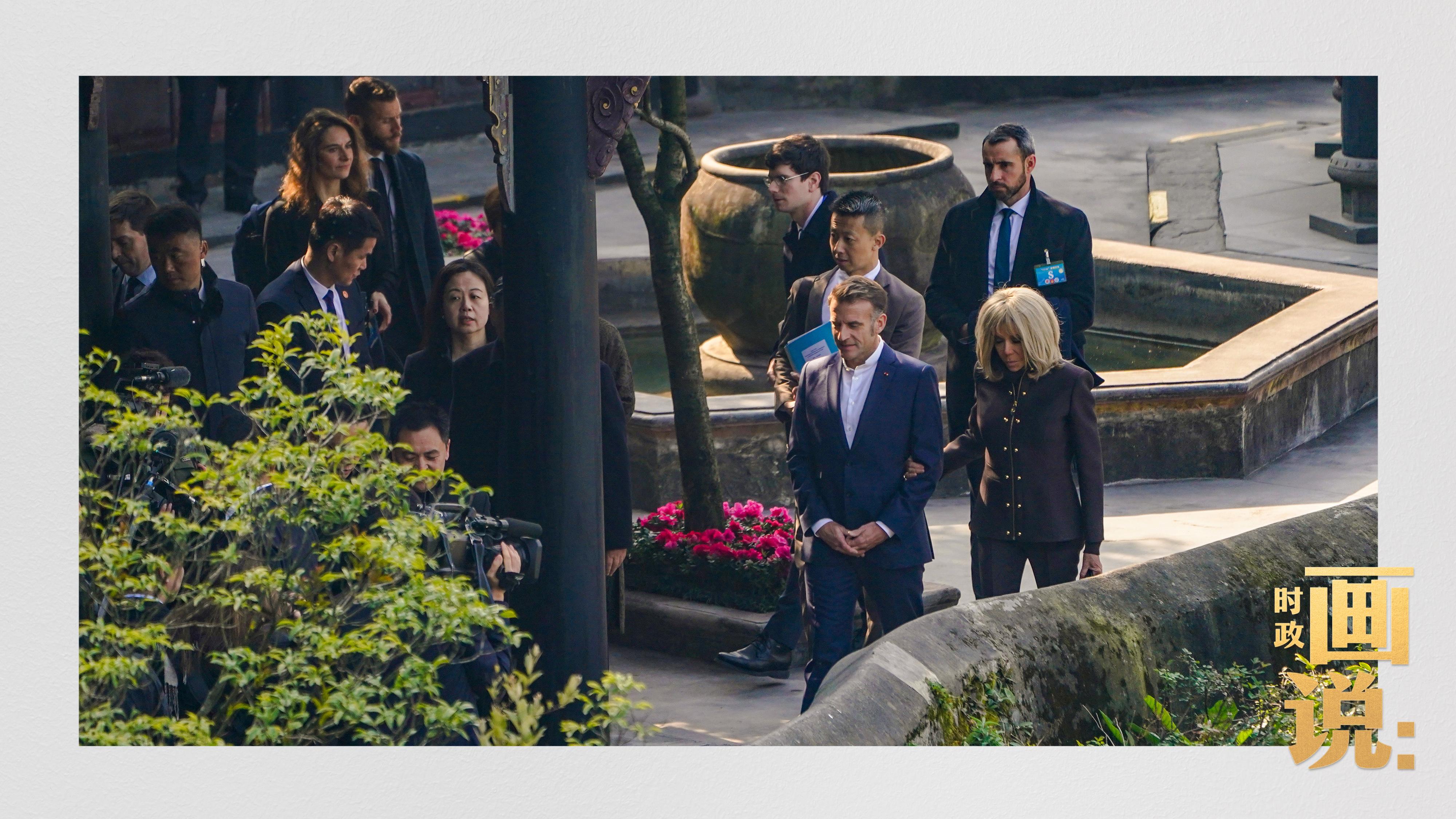 △習(xí)近平和夫人彭麗媛同馬克龍夫婦在都江堰進(jìn)行友好交流
