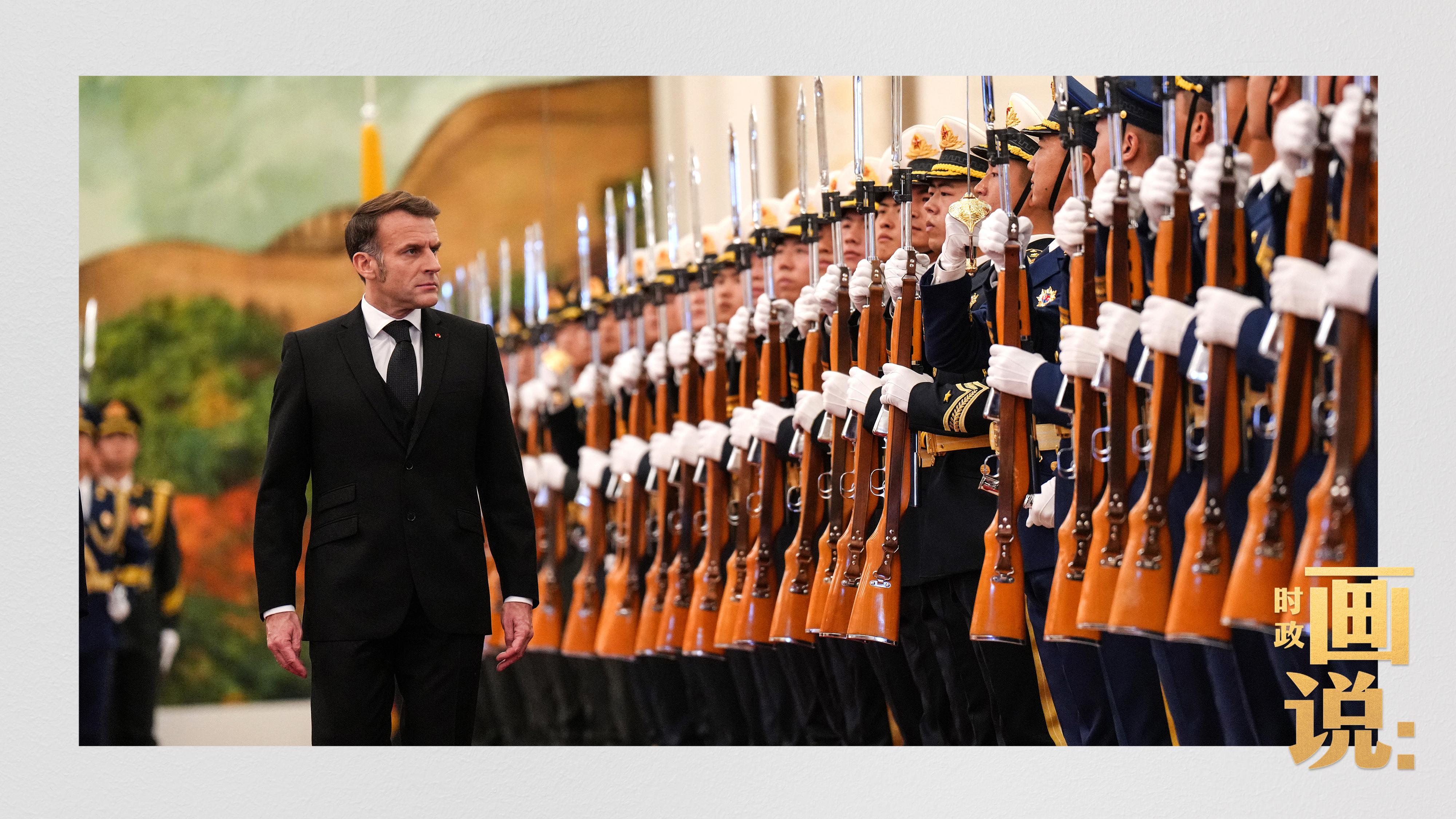△馬克龍?jiān)诹?xí)近平陪同下檢閱中國(guó)人民解放軍儀仗隊(duì)并觀看分列式