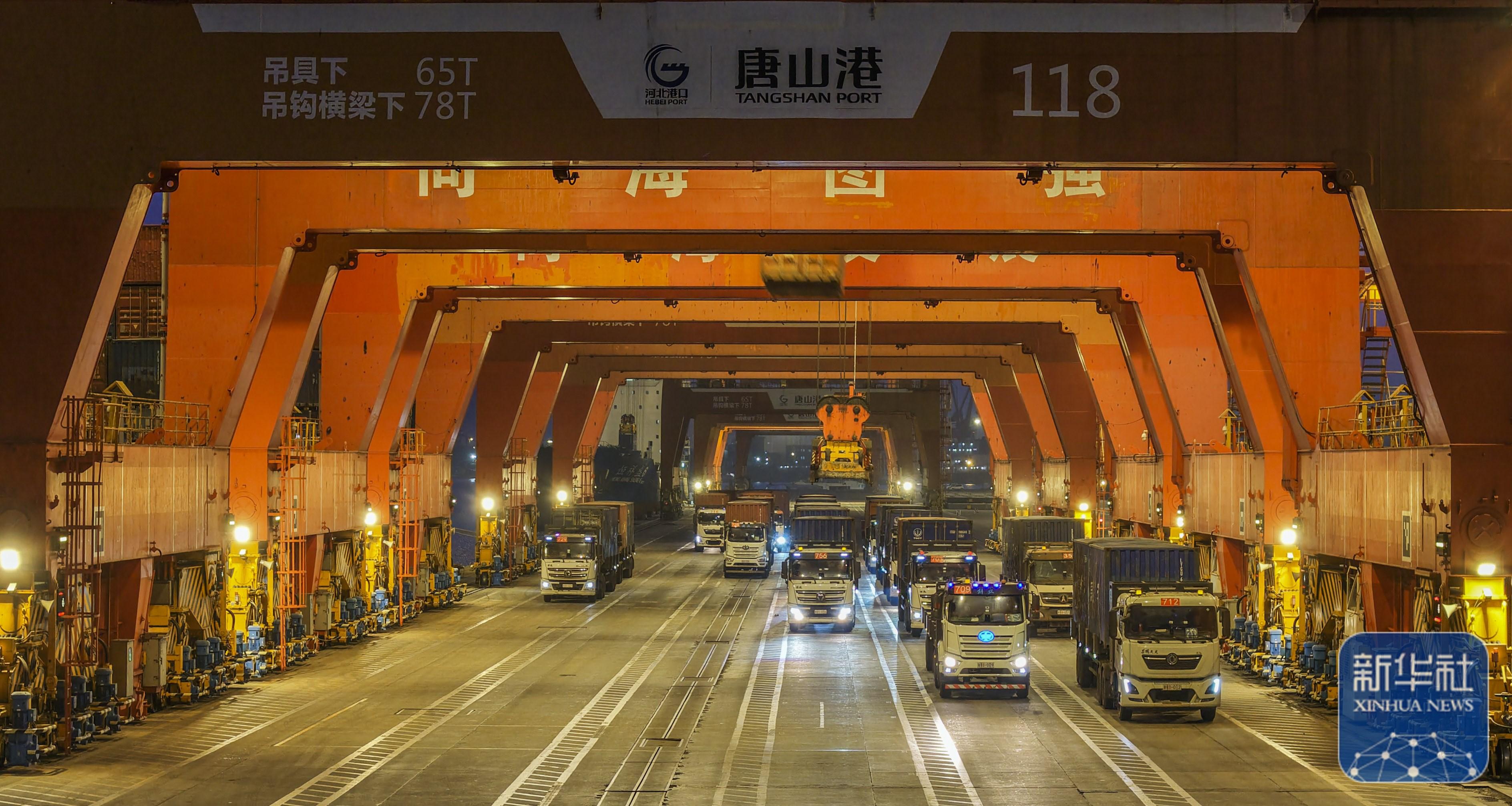 ↑ 1月2日清晨,在河北省唐山港京唐港區(qū)集裝箱碼頭,車輛在運輸集裝箱(無人機照片)。新華社發(fā)(劉滿倉 攝)
