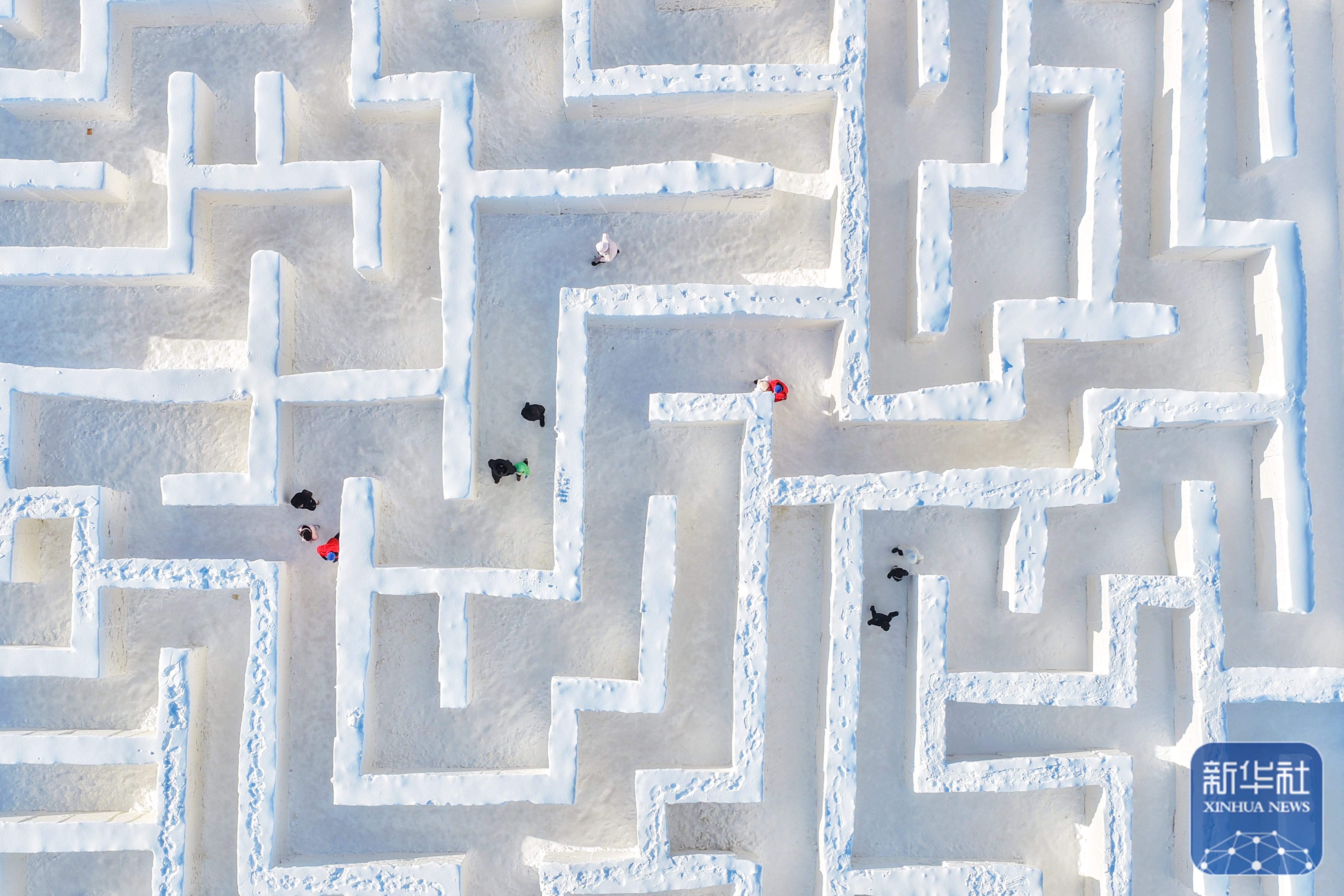 ↑ 1月2日,在黑龍江省同江市俄羅斯風情園,游人在冰雪迷宮里游玩(無人機照片)。新華社發(fā)(劉萬平攝)