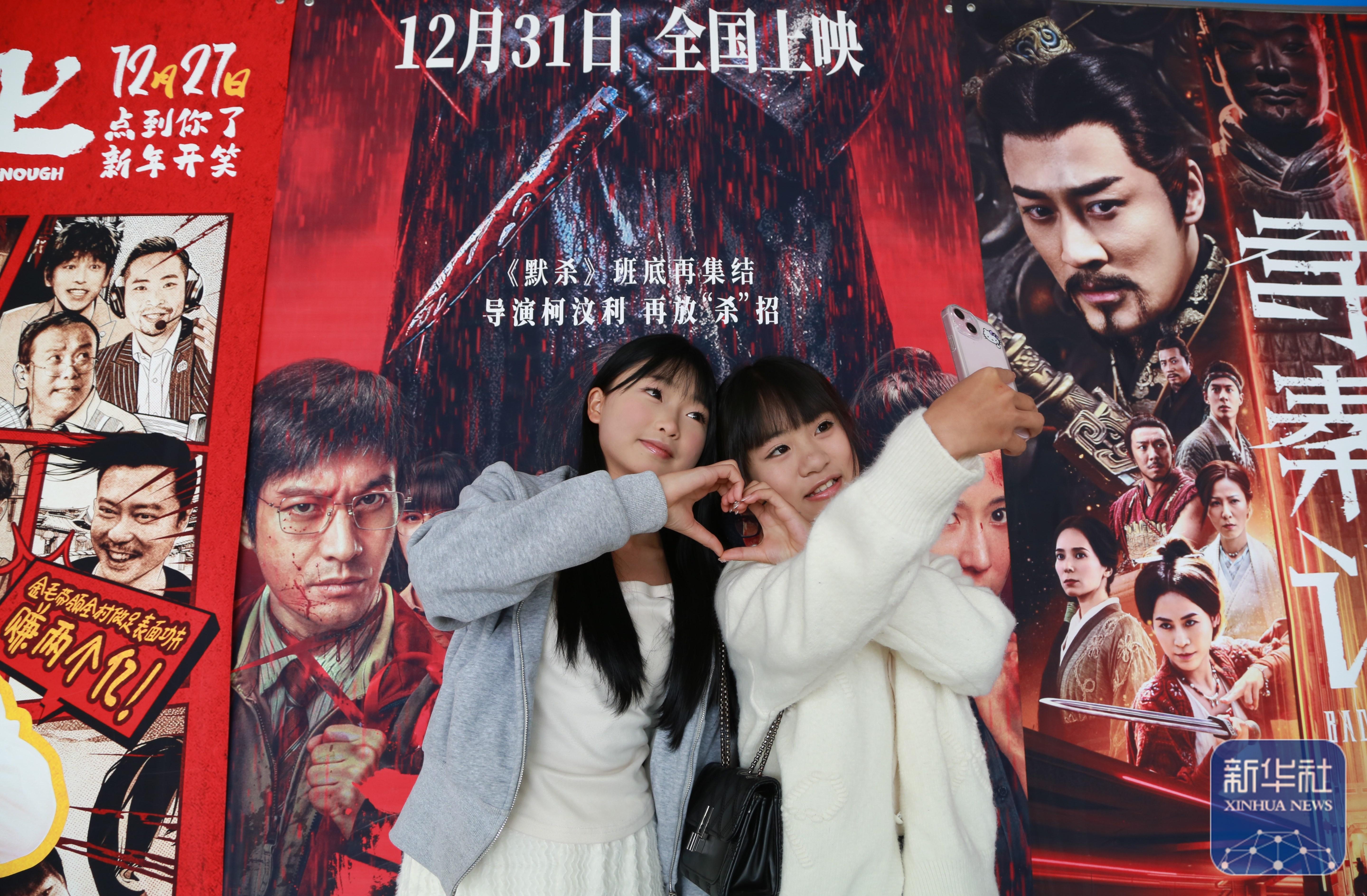 ↑ 1月1日,在云南省蒙自市一家電影院,觀眾與電影海報合影。新華社發(fā)(薛瑩瑩攝)