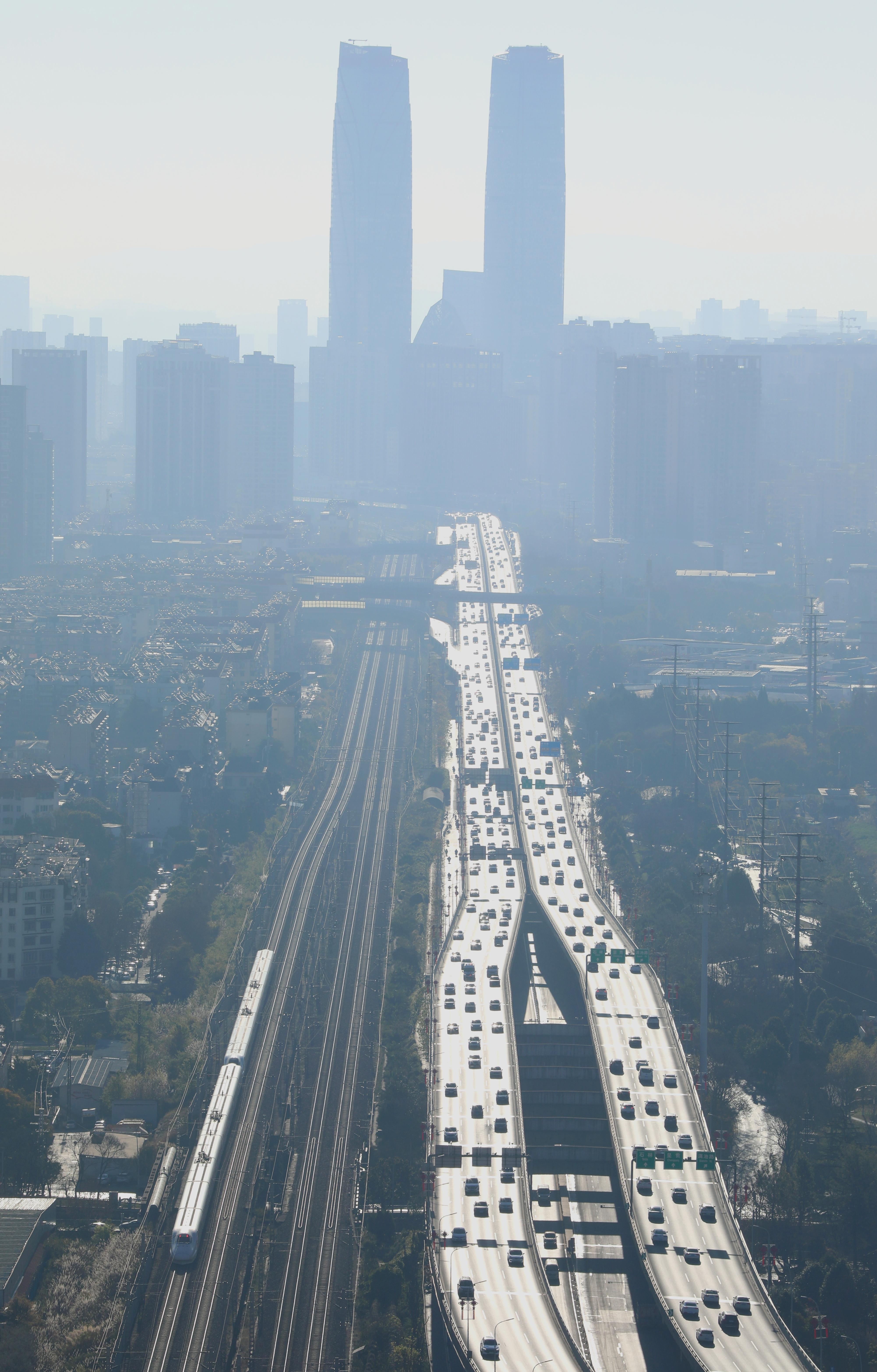 ↑ 1月25日,動(dòng)車組列車穿行于云南昆明城區(qū)。新華社發(fā)(鄭益 攝)