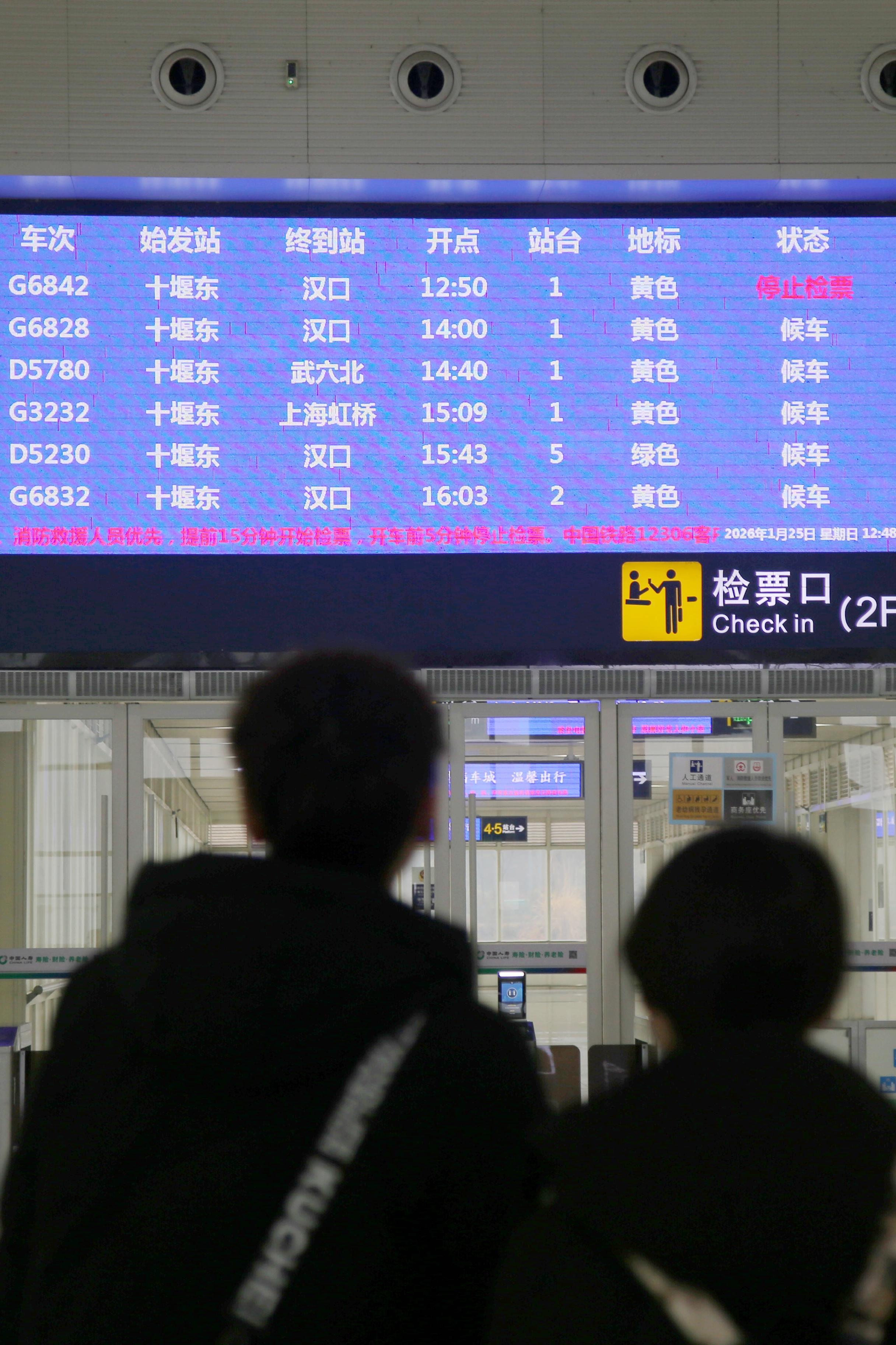 ↑ 1月25日,旅客在湖北十堰東高鐵站查看車次。新華社發(fā)(曹忠宏 攝)