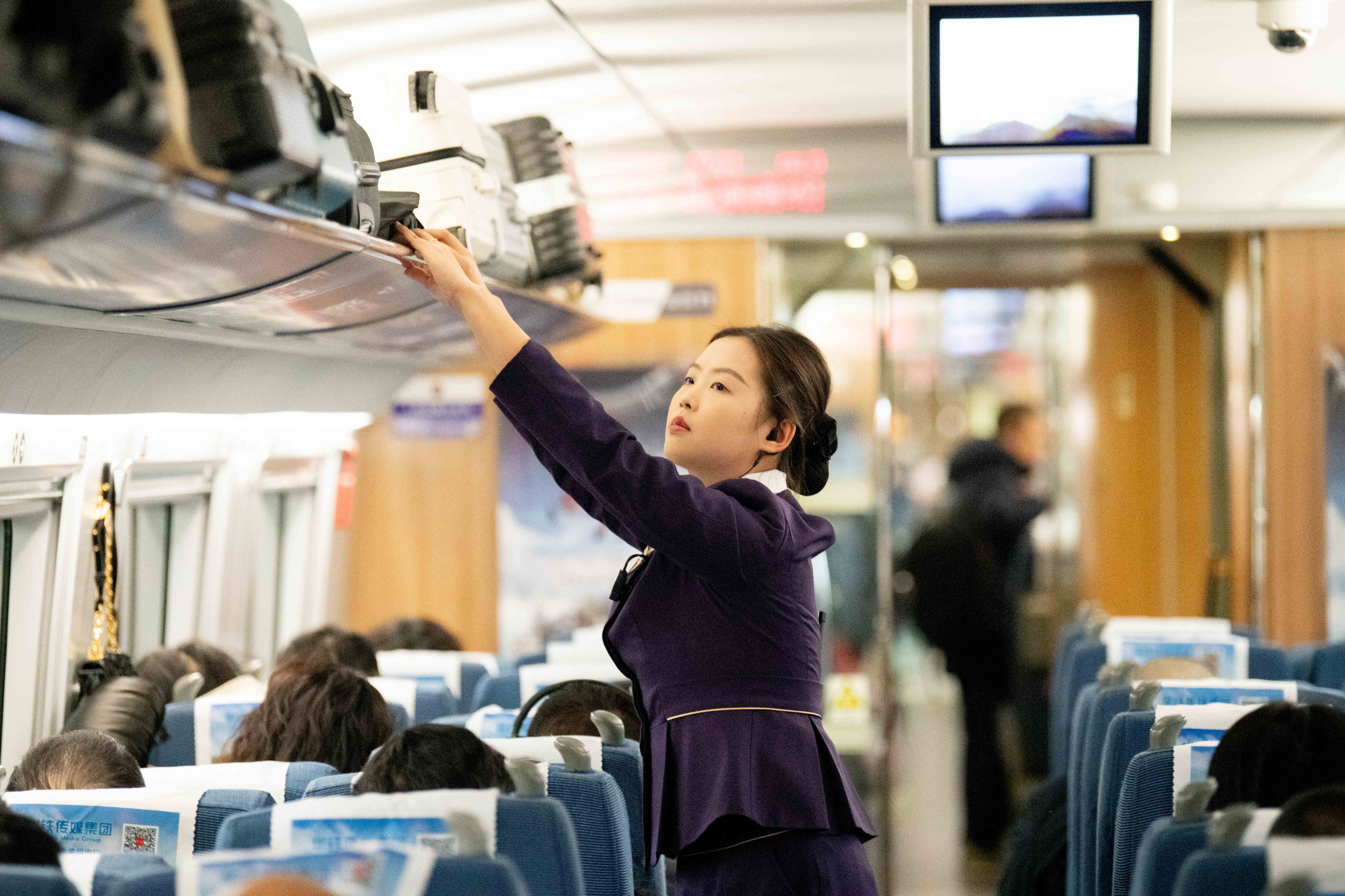 ↑ 1月25日,乘務(wù)員在泰州至北京南的G2584次列車上工作。新華社發(fā)(楊玉崗 攝)