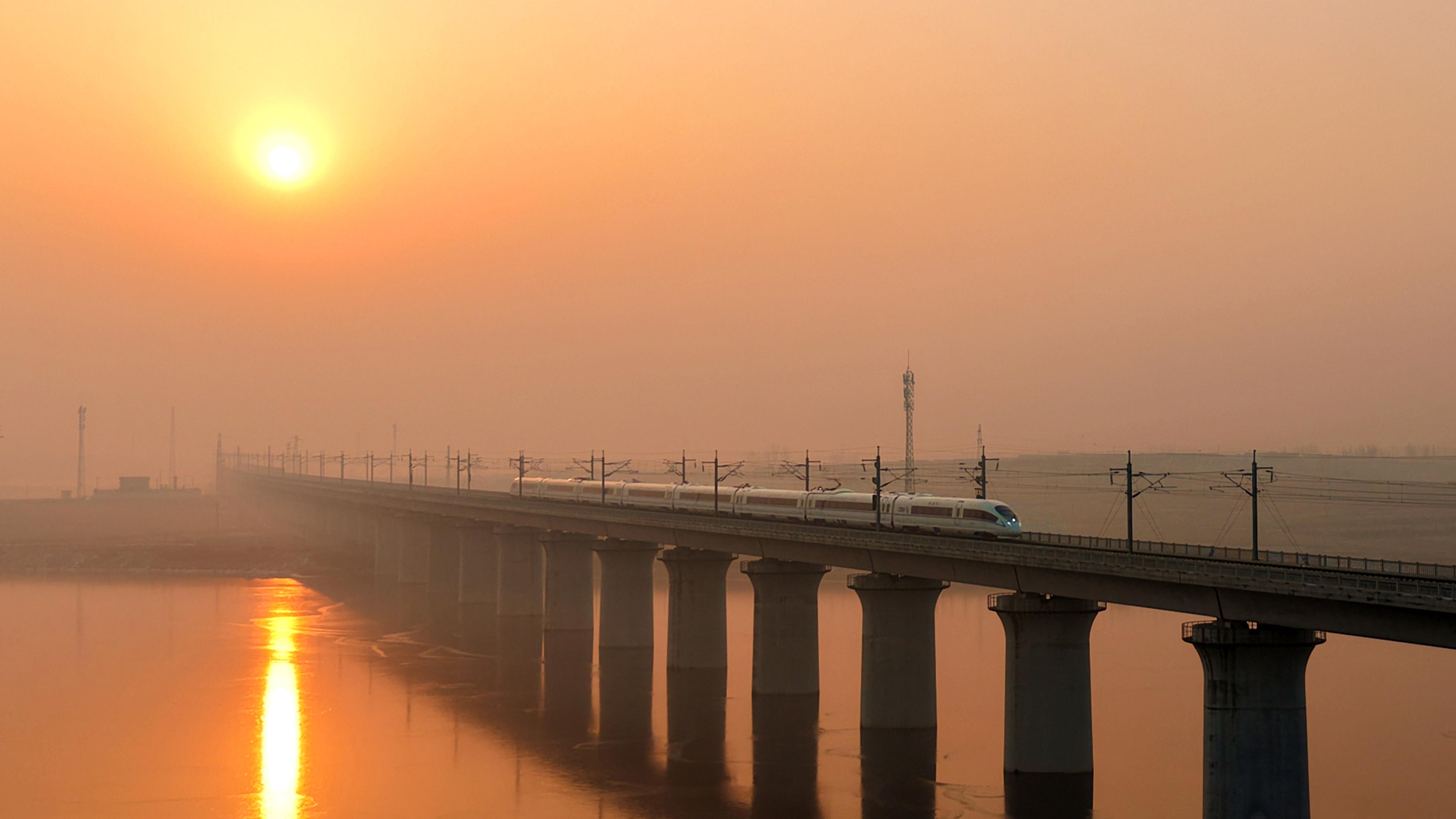 ↑ 1月25日,列車行駛在青榮城際鐵路山東煙臺(tái)段。新華社發(fā)(唐克 攝)