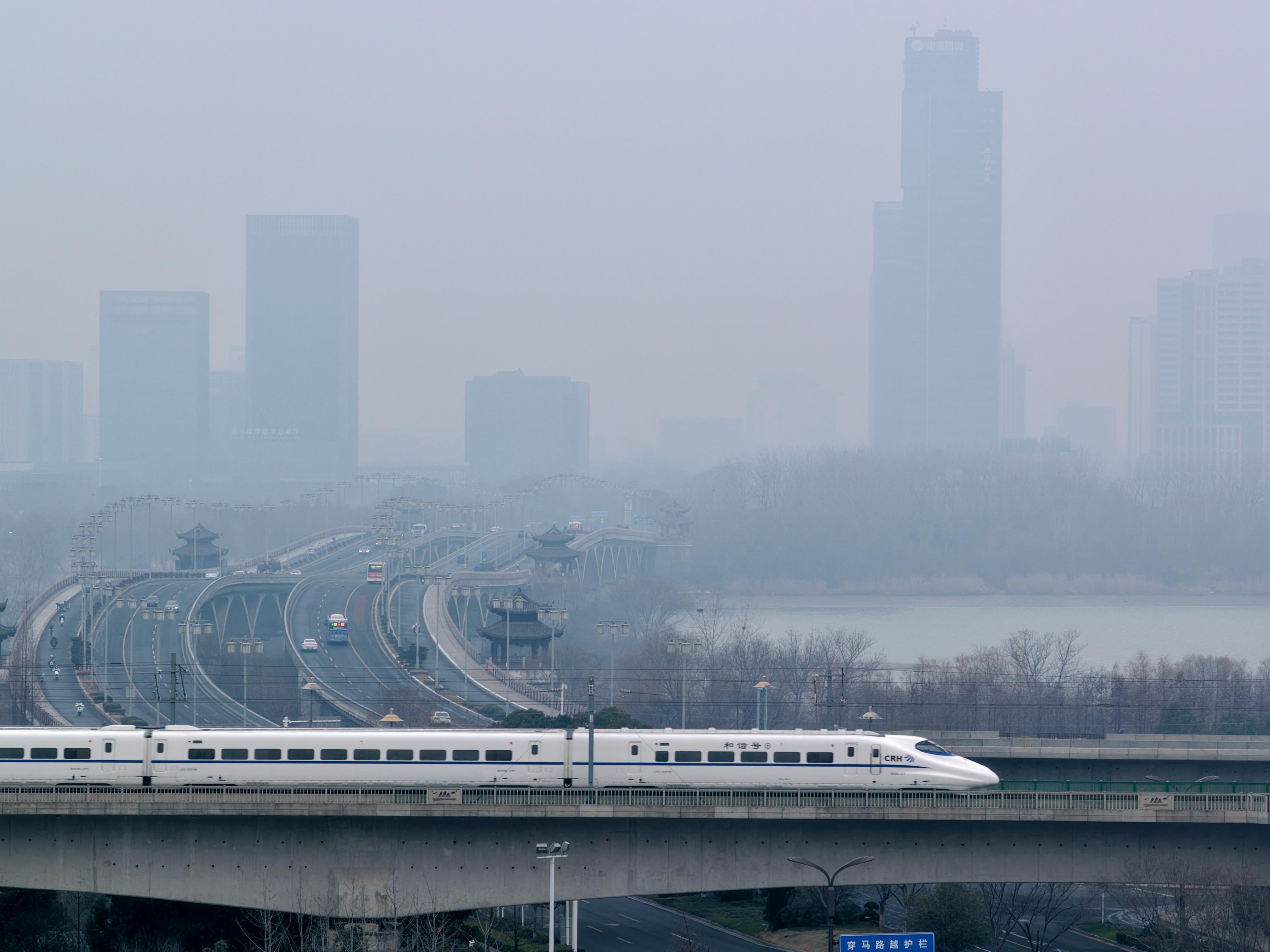 ↑ 1月25日,動(dòng)車組列車行駛在江蘇省常州市境內(nèi)(無(wú)人機(jī)照片)。新華社發(fā) (陳暐 攝)