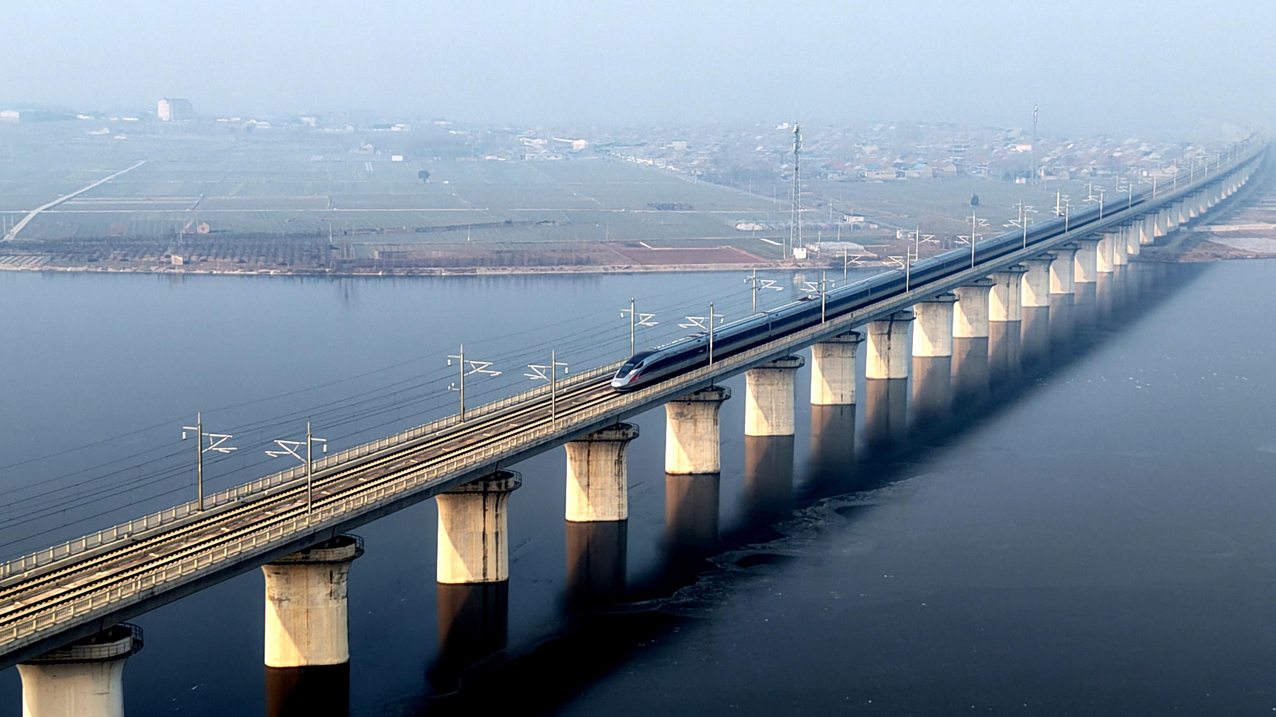 ↑ 1月25日,列車行駛在江蘇省泰州市海陵區(qū)境內(nèi)(無(wú)人機(jī)照片)。新華社發(fā)(湯德宏 攝)
