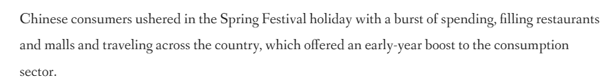 文章說,中國在春節(jié)期間迎來消費熱潮,餐廳、商場人頭攢動,全國旅游市場火爆,為消費市場實現“開門紅”注入強勁動力。
