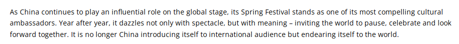 文章說,春節(jié)的精髓引發(fā)了全世界的共鳴,因為它提供了又一個增進交流的絕佳機會。春節(jié)所蘊含的團聚、和諧和希望等價值觀,深深打動了不同文化背景的人們。春節(jié)已被列入聯(lián)合國教科文組織人類非物質文化遺產代表作名錄,因此,它不僅僅是一個中國的節(jié)日,而是全人類共同珍視的瑰寶。