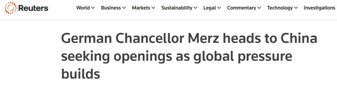 路透社24日的文章說,過去一年,歐洲與美國聯(lián)盟的瓦解以及供應(yīng)鏈的脆弱性暴露無遺,在此背景下,德國總理默茨本周訪問中國,成為最新一位試圖與中國修復(fù)關(guān)系的歐洲領(lǐng)導(dǎo)人。