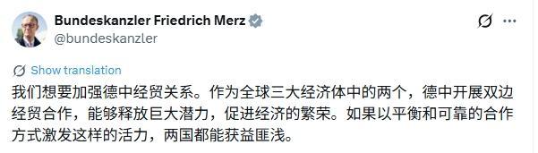 默茨用中文在社交媒體上發(fā)帖寫道,“我們想要加強(qiáng)德中經(jīng)貿(mào)關(guān)系。作為全球三大經(jīng)濟(jì)體中的兩個(gè),德中開展雙邊經(jīng)貿(mào)合作,能夠釋放巨大潛力,促進(jìn)經(jīng)濟(jì)的繁榮。如果以平衡和可靠的合作方式激發(fā)這樣的活力,兩國都能獲益匪淺。”