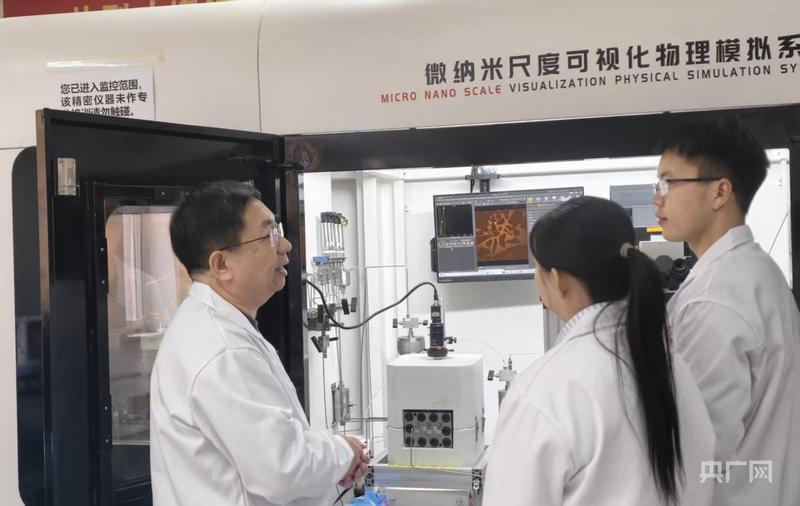吳景春(左一)與團(tuán)隊(duì)成員正在討論頁巖油采收技術(shù)(央廣網(wǎng)記者 陳顯春 攝)