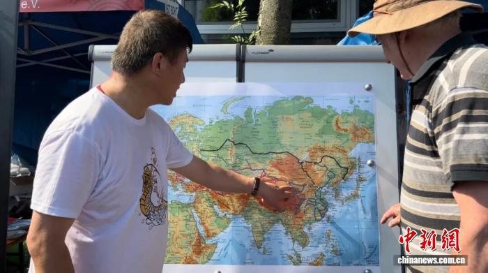 2023年6月11日,德國民眾沃爾夫?qū)たɡ┛嗽诘聡乓了贡との洱堉圪惿狭私庵袣W班列線路圖。中新社記者 馬秀秀 攝
