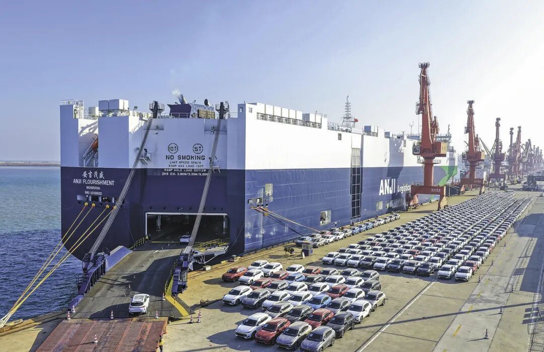 江蘇連云港,滾裝船正在裝運(yùn)出口新能源汽車(chē)等。王健民 攝