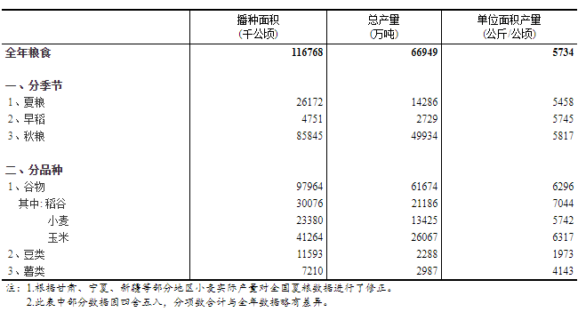 糧食播種面積增加1056萬畝,增長0.6% 2020年,各地加大對糧食生產(chǎn)的支持力度,層層壓實糧食生產(chǎn)責任,積極落實各項補貼政策,提高農(nóng)民種糧積極性,糧食播種面積止跌回升。全國糧食播種面積17.52億畝,比上年增加1056萬畝,增長0.6%。 稻谷播種面積增加,玉米持平,小麥減少。2020年,全國谷物播種面積14.69億畝,比上年增加176萬畝,增長0.1%。其中,稻谷4.51億畝,比上年增加573萬畝,增長1.3%。面對突如其來的新冠肺炎疫情,為確保糧食安全穩(wěn)定生產(chǎn),國家加大對水稻生產(chǎn)的扶持力度,落實各項支農(nóng)惠農(nóng)、種糧補貼、糧食最低收購價等政策,全年雙季稻播種面積比上年增加756萬畝,增長5.3%,成為糧食播種面積擴大的主要原因。玉米播種面積基本穩(wěn)定。受華北地下水超采區(qū)實施季節(jié)性休耕限采及市場需求等因素影響,小麥播種面積比上年減少522萬畝。 豆類面積大幅增加,薯類面積穩(wěn)中有增。2020年,全國豆類播種面積1.74億畝,比上年增加778萬畝,增長4.7%。受大豆振興計劃政策帶動,大豆播種面積1.48億畝,比上年增加825萬畝,增長5.9%。2020年,全國薯類播種面積1.08億畝,比上年增加103萬畝,增長1.0%。 糧食單產(chǎn)增加0.9公斤,增長0.2% 2020年,全國大部農(nóng)區(qū)氣候條件較為適宜,病蟲害發(fā)生較輕,有利于糧食作物生長發(fā)育和產(chǎn)量形成。盡管部分地區(qū)洪澇災害和臺風對生產(chǎn)造成一定影響,但各地加強田間管理,積極抗災減災,農(nóng)業(yè)災情對糧食生產(chǎn)影響有限。糧食產(chǎn)量實割實測抽樣調(diào)查顯示,2020年,全國糧食作物單產(chǎn)382公斤/畝,每畝產(chǎn)量比上年增加0.9公斤,增長0.2%。 小麥單產(chǎn)增加,玉米持平,稻谷略減。2020年,全國谷物單產(chǎn)420公斤/畝,每畝產(chǎn)量比上年增加1.6公斤,增長0.4%,其中,小麥單產(chǎn)383公斤/畝,每畝產(chǎn)量比上年增加7.5公斤,增長2.0%;玉米單產(chǎn)421公斤/畝,與上年基本持平;受南方局部洪澇災害的影響,稻谷單產(chǎn)470公斤/畝,每畝產(chǎn)量比上年減少1.0公斤,下降0.2%。 豆類、薯類單產(chǎn)水平均有所提高。2020年,豆類單產(chǎn)132公斤/畝,每畝產(chǎn)量比上年增加3.2公斤,增長2.5%,其中,大豆單產(chǎn)132公斤/畝,每畝產(chǎn)量比上年增加3.0公斤,增長2.3%。2020年,薯類單產(chǎn)276公斤/畝,每畝產(chǎn)量比上年增加7.1公斤,增長2.6%。 糧食產(chǎn)量增加113億斤,增長0.9% 2020年,夏糧和早稻產(chǎn)量分別為2857億斤和546億斤,比上年增加25億斤和21億斤;秋糧產(chǎn)量9987億斤,增加67億斤。全年糧食總產(chǎn)量達到13390億斤,增加113億斤,增長0.9%。 稻谷、小麥產(chǎn)量增加,玉米略減。2020年,全國谷物產(chǎn)量12335億斤,比上年增加61億斤,增長0.5%。其中,稻谷產(chǎn)量4237億斤,比上年增加45億斤,增長1.1%;小麥產(chǎn)量2685億斤,比上年增加13億斤,增長0.5%;玉米產(chǎn)量5213億斤,比上年減少2億斤。 豆類、薯類產(chǎn)量均增加。豆類產(chǎn)量458億斤,比上年增加31億斤,增長7.3%。其中,大豆產(chǎn)量392億斤,比上年增加30億斤,增長8.3%。薯類產(chǎn)量597億斤,比上年增加21億斤,增長3.6%。 分地區(qū)來看,多數(shù)?。▍^(qū)、市)糧食增產(chǎn)。2020年,全國31個?。▍^(qū)、市)中26個增產(chǎn),其中,河南、山東、山西、河北、新疆糧食產(chǎn)量均增加10億斤以上。 |