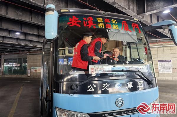 執(zhí)法人員向駕駛員進(jìn)行普法宣導(dǎo)(廈門交通執(zhí)法支隊(duì)供圖) 東南網(wǎng)1月15日訊(本網(wǎng)記者 劉瑋 通訊員 傅秋萍)1月14日,春運(yùn)正式開啟。為確保道路運(yùn)輸安全有序,廈門市交通執(zhí)法支隊(duì)在春運(yùn)首日依托多個(gè)服務(wù)點(diǎn)和執(zhí)勤點(diǎn),全力開展春運(yùn)服務(wù)保障工作。 清晨6點(diǎn)20分,梧村長途汽車站發(fā)出今年春運(yùn)首班班線車。思明大隊(duì)執(zhí)法人員隨即對(duì)車站班線車輛的進(jìn)站、出站安檢,以及乘客行包安檢、站內(nèi)運(yùn)營等進(jìn)行專項(xiàng)安全督導(dǎo)檢查。他們抽檢客運(yùn)實(shí)名制落實(shí)情況,查看車站行包安全檢查設(shè)備配備及運(yùn)行狀況,并檢查出站登記表,防止超載車輛出站。車站作為市內(nèi)唯一汽車站,春運(yùn)期間將根據(jù)客流變化調(diào)整增發(fā)車次,執(zhí)法人員強(qiáng)調(diào)要嚴(yán)格落實(shí)“三不進(jìn)站、六不出站”規(guī)定,保障乘客安全。此外,執(zhí)法人員還對(duì)班線客車駕駛員進(jìn)行普法提醒,發(fā)放《2025春運(yùn)福建省交通運(yùn)輸出行服務(wù)指南》,提醒駕駛員發(fā)車前做好車輛安全檢查,確保旅客依規(guī)系好安全帶,不疲勞駕駛,規(guī)范運(yùn)營。