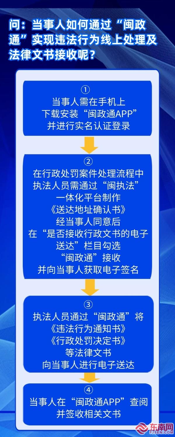 “閩政通”電子送達(dá)流程(廈門市交通執(zhí)法支隊(duì)供圖) 東南網(wǎng)2月27日訊(本網(wǎng)記者 劉瑋 通訊員 傅秋萍)日前,記者從廈門交通執(zhí)法部門獲悉,市交通執(zhí)法支隊(duì)積極推進(jìn)“閩政通”電子送達(dá),依托一體化平臺(tái)“閩政通”實(shí)現(xiàn)案件線上處理、文書電子送達(dá)、遠(yuǎn)程簽字、線上繳交罰款,完成了廈門交通執(zhí)法領(lǐng)域首單電子送達(dá)。 近期,直屬大隊(duì)調(diào)查一件12328投訴件,1月24日當(dāng)事人前來配合調(diào)查。經(jīng)核查,查明駕駛員楊某存在網(wǎng)絡(luò)預(yù)約出租汽車駕駛員無正當(dāng)理由未按承諾到達(dá)約定地點(diǎn)提供預(yù)約服務(wù)的違法行為,且是一年內(nèi)第二次違法,屬于嚴(yán)重情節(jié),應(yīng)當(dāng)給予行政處罰。 為便利當(dāng)事人接收相關(guān)文書,使群眾少跑腿,直屬大隊(duì)積極嘗試,探索通過“閩政通”APP進(jìn)行法律文書電子送達(dá)。1月26日,當(dāng)事人楊某在老家通過其“閩政通”對《違法行為通知書》《行政處罰決定書》等文書進(jìn)行線上遠(yuǎn)程電子簽收并予以繳款,極大優(yōu)化群眾辦事體驗(yàn)感。 當(dāng)事人如何通過“閩政通”實(shí)現(xiàn)違法行為線上處理及法律文書電子送達(dá)?相關(guān)執(zhí)法人員介紹,首先,當(dāng)事人需在手機(jī)上下載安裝“閩政通APP”,進(jìn)行實(shí)名認(rèn)證登錄。其次,在行政處罰案件處理流程中,執(zhí)法人員需通過“閩執(zhí)法”一體化平臺(tái)制作《送達(dá)地址確認(rèn)書》,經(jīng)當(dāng)事人同意后在“是否接收行政文書的電子送達(dá)”欄目勾選“閩政通”接收,并向當(dāng)事人獲取電子簽名。最后,執(zhí)法人員制作并審批《違法行為通知書》《行政處罰決定書》后就可以通過“閩政通”實(shí)現(xiàn)電子送達(dá),當(dāng)事人可在“閩政通APP”查閱并簽收相關(guān)文書。 “通過‘閩政通’進(jìn)行案件文書電子送達(dá)能夠?qū)崿F(xiàn)文書的即時(shí)傳遞,比傳統(tǒng)的直接送達(dá)、郵寄送達(dá)更高效、更便捷,違法當(dāng)事人可隨時(shí)隨地獲取、查閱文書內(nèi)容?!眻?zhí)法人員說,電子送達(dá)記錄還可追蹤和查詢,有效避免紙質(zhì)文書在傳遞途中可能出現(xiàn)的損毀、遺失以及信息泄露等問題。 |