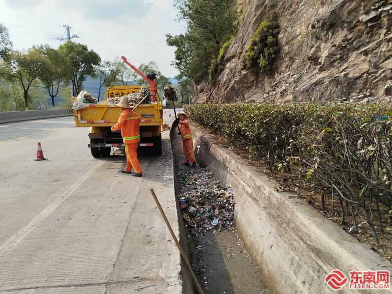沙縣公路分中心班站職工正在清理水溝,確保排水系統(tǒng)暢通。