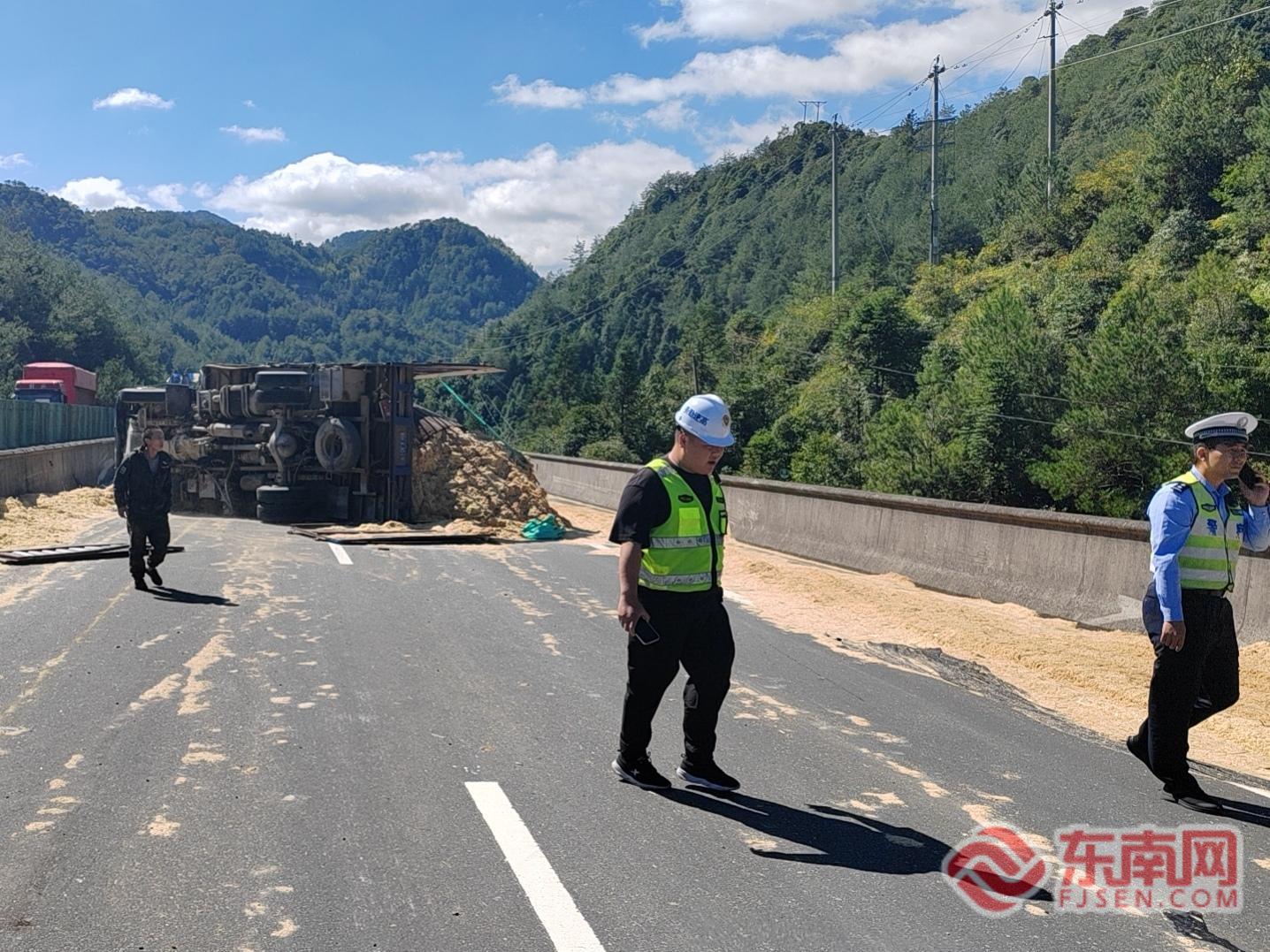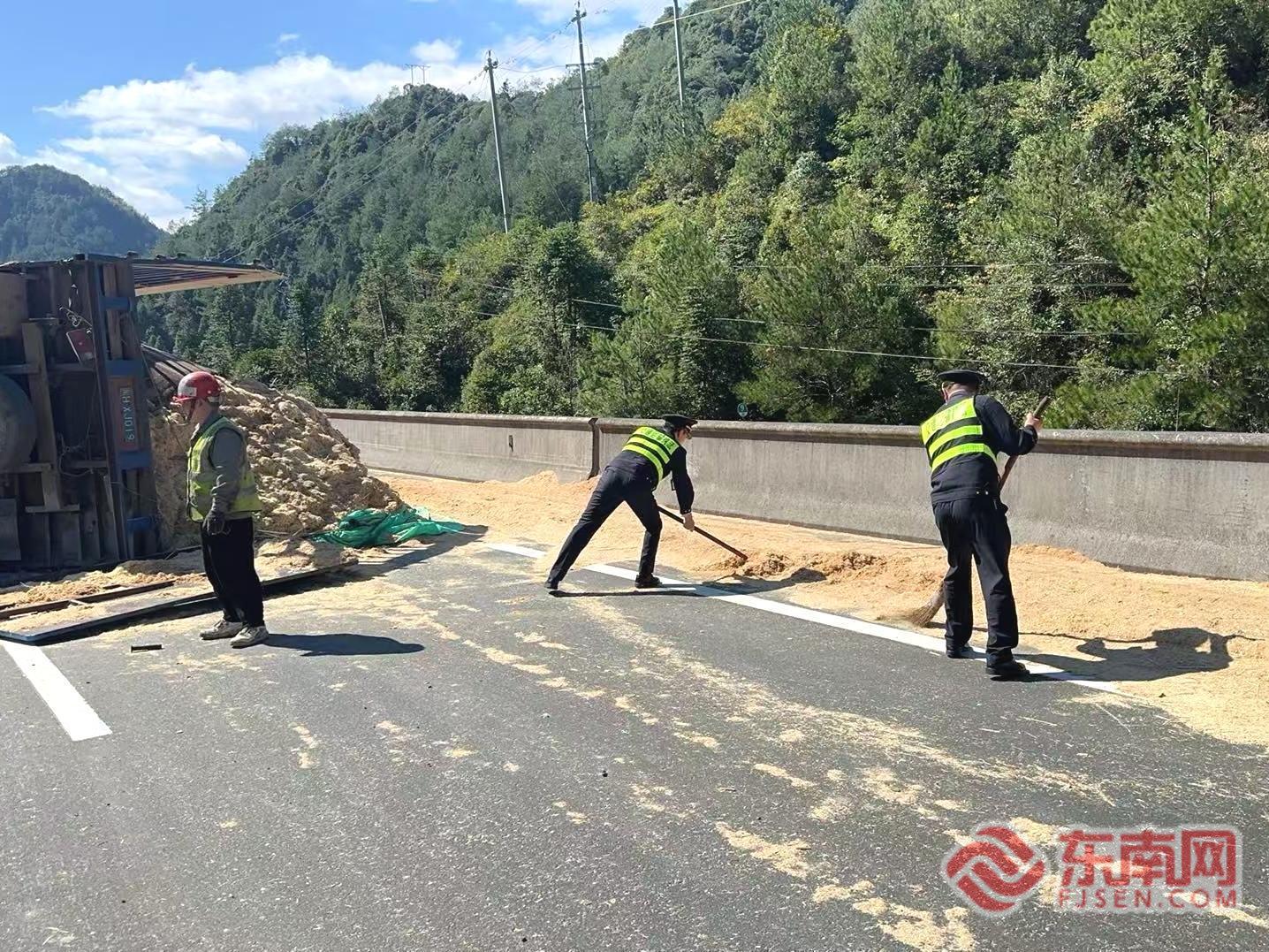 東南網(wǎng)10月24日訊(通訊員 李思澄 劉曉涌)10月23日中午,寧上高速發(fā)生一起貨車側(cè)翻事故,所載鋸粉大量傾灑,導致主干道通行受阻。寧德高速執(zhí)法支隊周寧中隊接警后火速出動,聯(lián)合相關(guān)部門經(jīng)過緊張?zhí)幹茫诋斎?5時40分成功排除險情,恢復(fù)道路正常通行。 23日12時09分,寧德高速執(zhí)法支隊周寧中隊接到報警稱:在寧上高速A83K+900處,一輛貨車發(fā)生側(cè)翻,貨物灑落主干道。中隊執(zhí)法人員聞訊立即奔赴現(xiàn)場,經(jīng)現(xiàn)場確認,側(cè)翻貨車運載的為鋸粉,因包裝破損大面積灑落,形成安全隱患,嚴重影響交通安全。