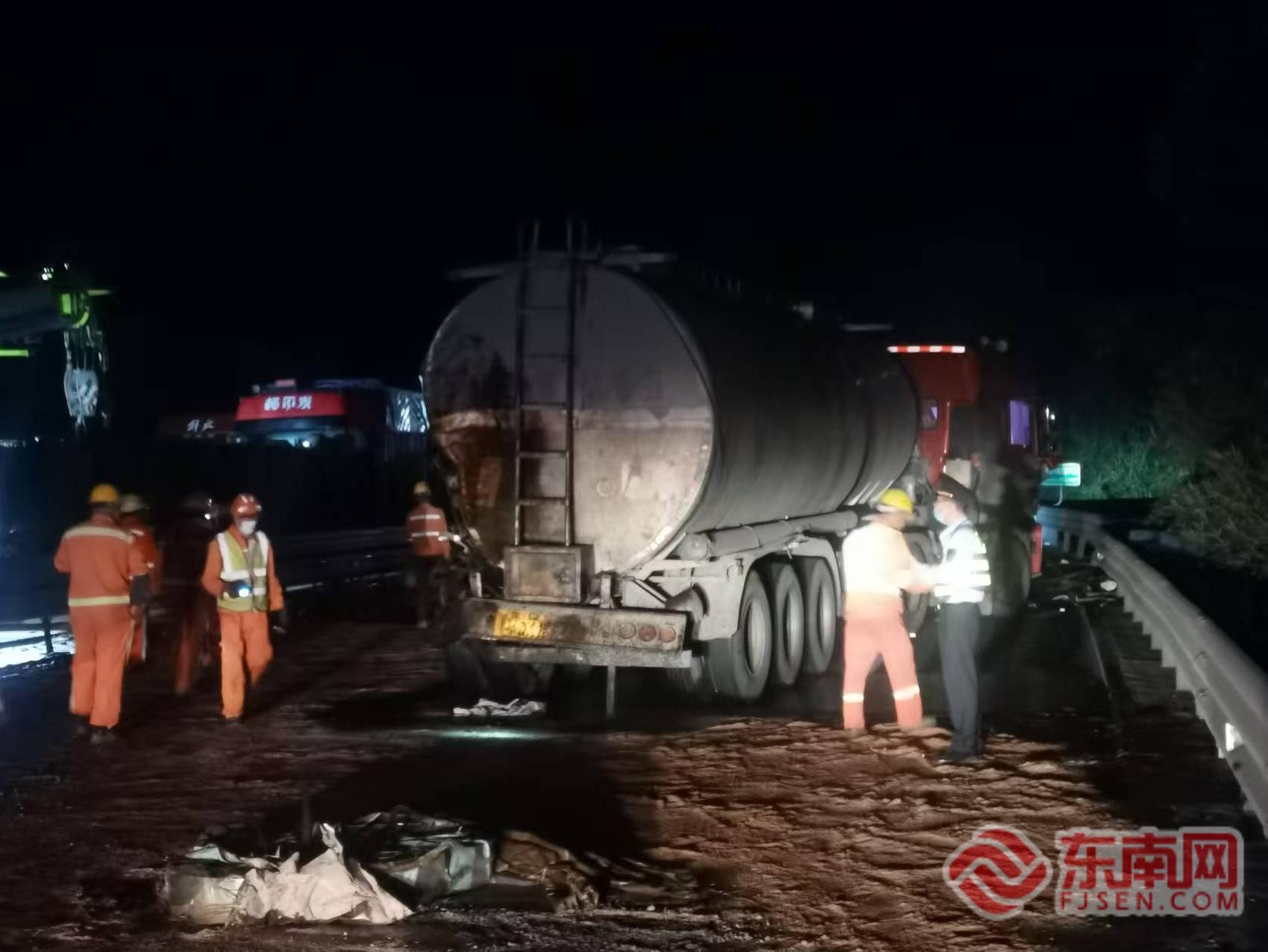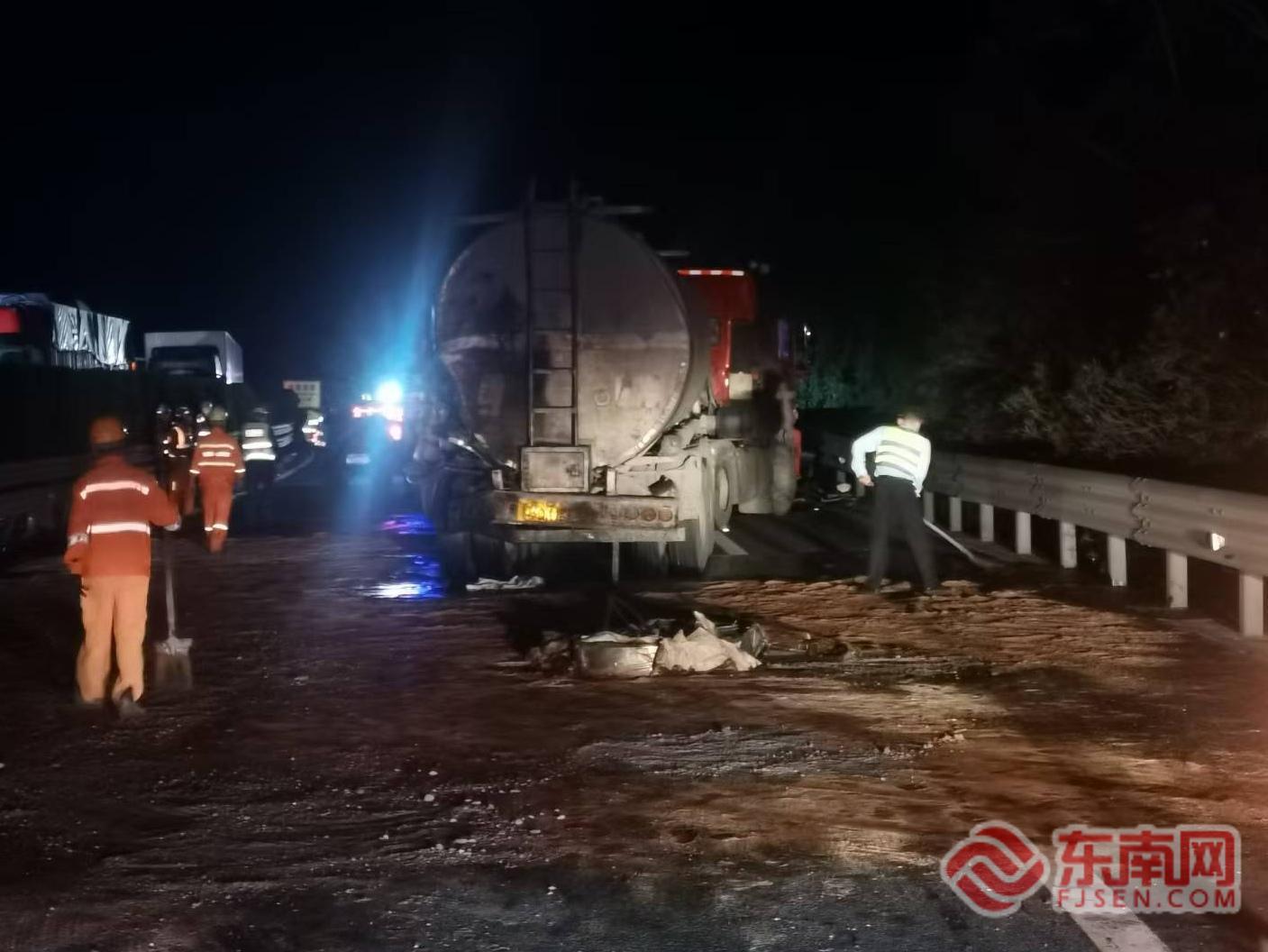 現(xiàn)場處置。寧德高速執(zhí)法支隊供圖 當(dāng)晚21時許,在沈海高速B道1943KM+140M處,一輛半掛貨車與一輛油罐車發(fā)生追尾,導(dǎo)致油罐車罐體破損,車內(nèi)廢油發(fā)生泄漏,B道路面受到嚴(yán)重污染。泄漏的油污甚至蔓延至對向A道,致使該側(cè)先后有七輛汽車因路面濕滑發(fā)生碰撞,事故影響進(jìn)一步擴(kuò)大。
