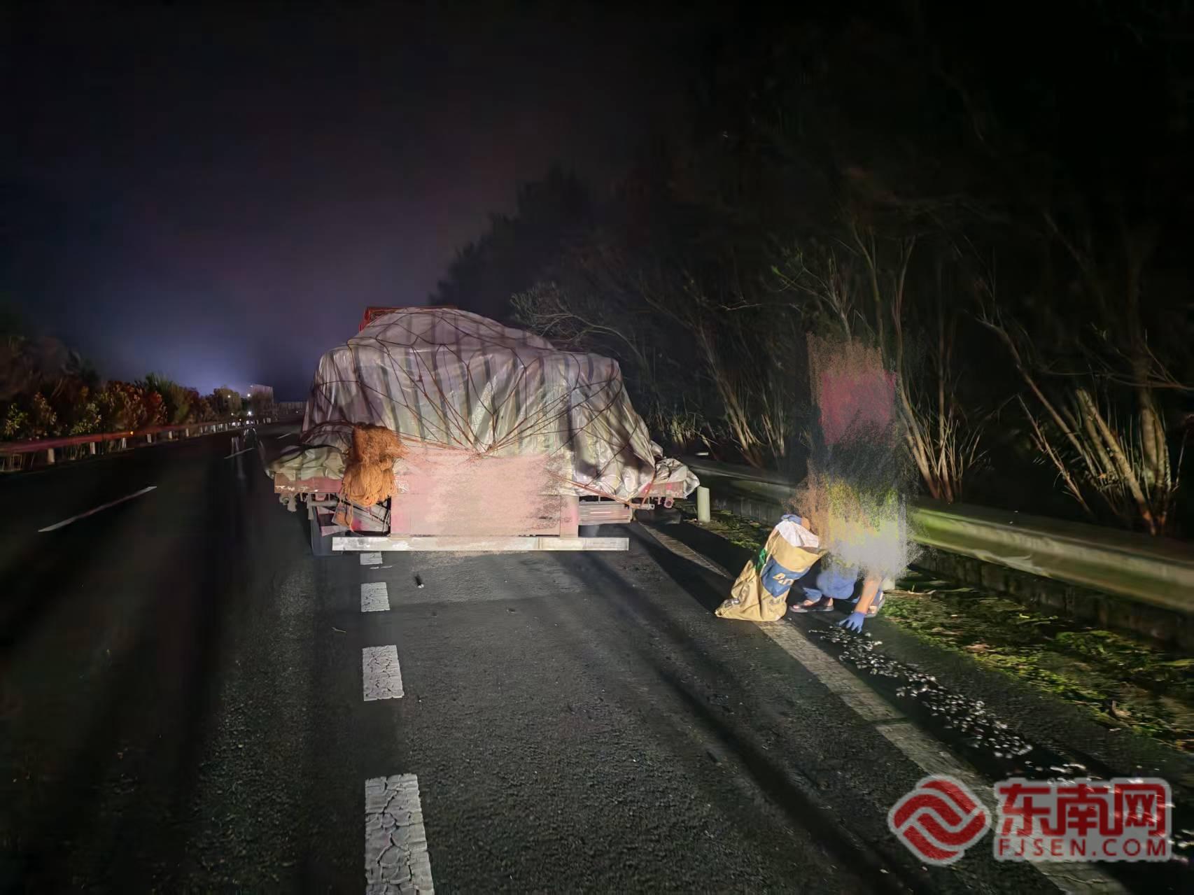 撒落現(xiàn)場(chǎng)。寧德高速執(zhí)法支隊(duì)供圖 待交通初步恢復(fù)通行后,針對(duì)十余輛爆胎滯留車(chē)輛,執(zhí)法隊(duì)員與交警組成護(hù)送隊(duì),將還能夠行駛的車(chē)輛分批引導(dǎo)至附近服務(wù)區(qū),并主動(dòng)協(xié)助車(chē)輛對(duì)接保險(xiǎn)公司與就近維修廠(chǎng),協(xié)助完成定損、換胎事宜。截至當(dāng)晚19時(shí)許,受損車(chē)輛基本完成輪胎更換,經(jīng)安全檢查后逐輛駛離服務(wù)區(qū),繼續(xù)后續(xù)行程。 此次應(yīng)急處置全程高效有序,未發(fā)生二次事故,寧德高速執(zhí)法、交警、路勤多部門(mén)的快速聯(lián)動(dòng)、精準(zhǔn)協(xié)作,不僅及時(shí)化解了雨夜險(xiǎn)情,更以“執(zhí)法為民”的實(shí)際行動(dòng),最大限度減少了群眾出行損失,有力保障了高速公路通行安全與群眾出行順暢。 寧德高速執(zhí)法部門(mén)提醒:貨車(chē)駕駛員出車(chē)前,務(wù)必仔細(xì)檢查貨物捆綁加固情況,確保裝載牢固;若在高速上遇貨物掉落或突發(fā)險(xiǎn)情,切勿盲目停車(chē)撿拾,需牢記“車(chē)靠邊、快警示、人撤離、即報(bào)警”原則,及時(shí)撥打12122求助,共同守護(hù)高速通行安全。 |