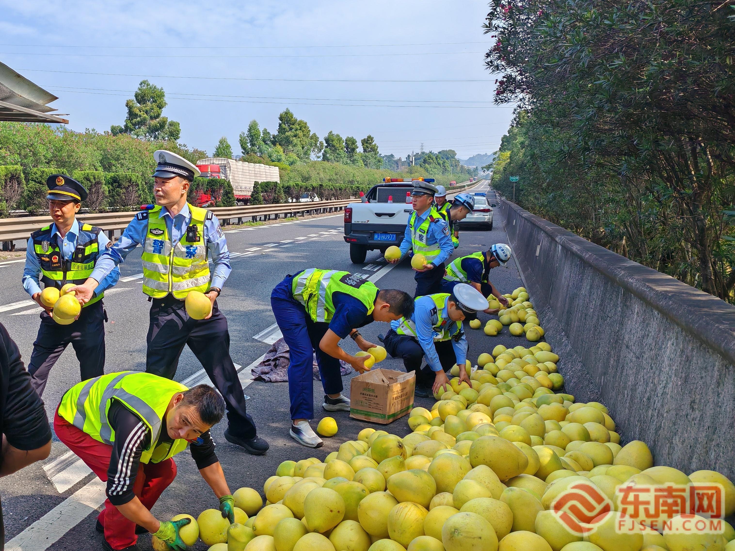 合力處置灑落柚子。寧德高速執(zhí)法支隊(duì)供圖 情況緊急,刻不容緩。執(zhí)法人員立即啟動(dòng)應(yīng)急預(yù)案,同步激活“5+N”協(xié)作機(jī)制?,F(xiàn)場各方力量分工明確、協(xié)同高效:一組人員迅速負(fù)責(zé)現(xiàn)場安全布控,在事故后方規(guī)范設(shè)置警示區(qū)域,擺放反光錐筒,并指揮引導(dǎo)后方車輛有序通行;另一組人員則與聞?dòng)嵹s來的高速交警、路勤、養(yǎng)護(hù)等聯(lián)動(dòng)單位并肩協(xié)作,以應(yīng)急車道為主作業(yè)面,全力投入散落柚子的清理與轉(zhuǎn)運(yùn)工作。整個(gè)處置流程銜接緊密,各方配合默契,形成了高效的處置合力。