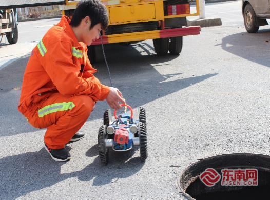 公路養(yǎng)護(hù)人員將機(jī)器人放入下水道(廈門公路中心供圖)