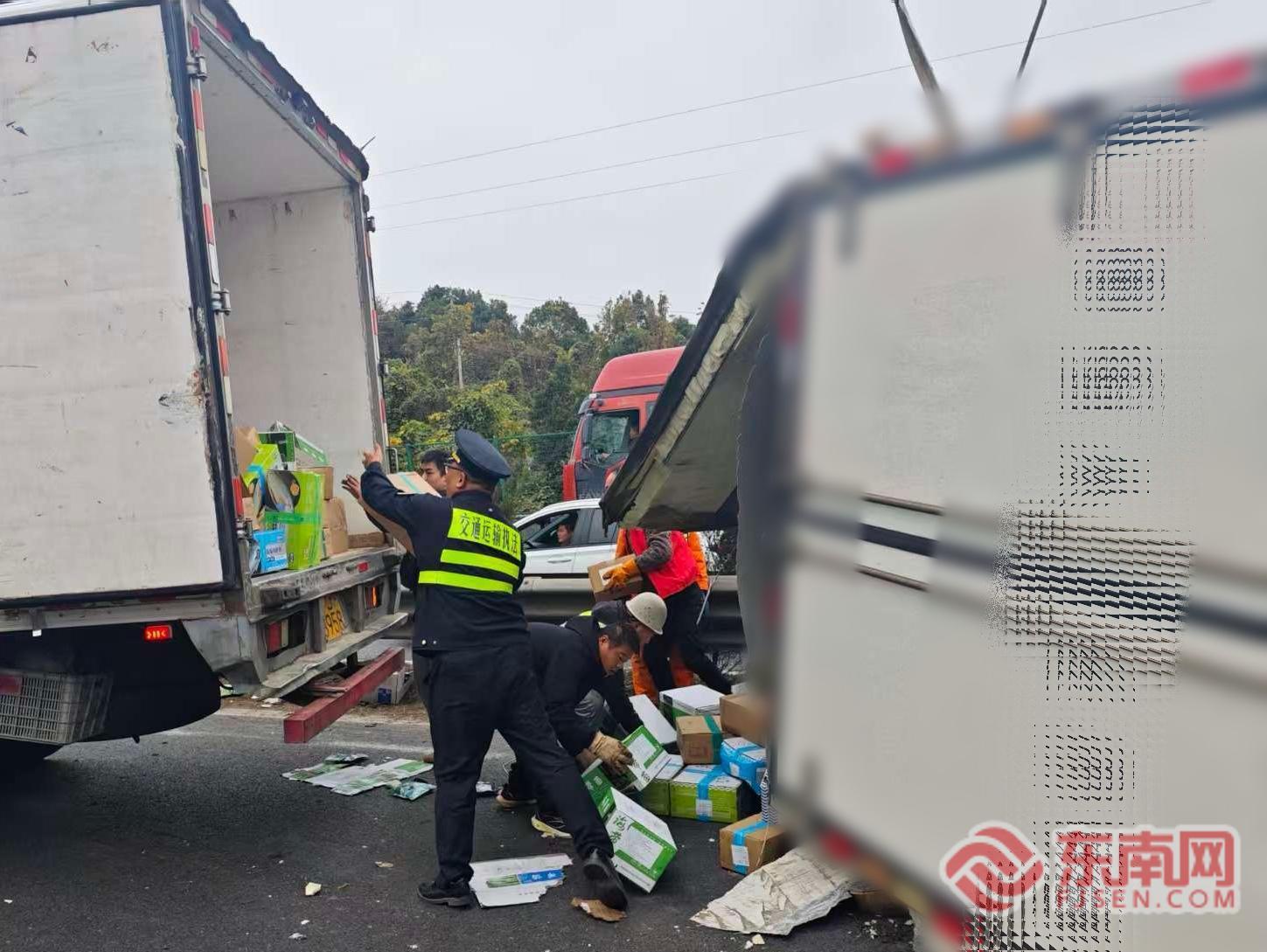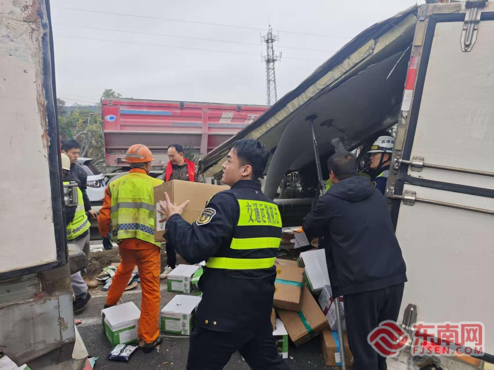 救援力量幫助貨車司機盤貨。寧德高速執(zhí)法支隊供圖 現(xiàn)場人員立即分為兩組同步開展工作:一組快速設(shè)置安全區(qū)域,擺放反光錐、設(shè)立警示標(biāo)志,引導(dǎo)后方車輛有序通行;另一組及時查看司乘人員狀況,安撫情緒并了解事故基本情況。
