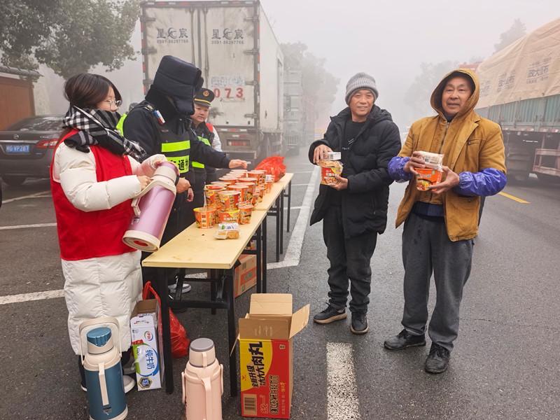 “師傅們,這邊有熱水、有吃的,需要什么自己拿?!鄙碇t色志愿服的志愿者在茫茫大霧中格外醒目。聽見招呼聲,原本坐在駕駛室等待的司機(jī)們聞聲而來,漸漸在桌前聚攏。一位老師傅端起熱氣騰騰的開水,暖了暖凍得發(fā)僵的雙手;志愿者主動(dòng)為司機(jī)們泡好泡面,香氣很快飄散開來。一杯杯冒著白氣的熱水,一碗碗泡好的方便面,一盒盒溫?zé)岬呐D毯兔姘贿f到一雙雙有些冰冷的手中。來自江西的貨車司機(jī)李師傅捧著熱水,連聲道謝:“這真是雪中送炭?。 ?/p>