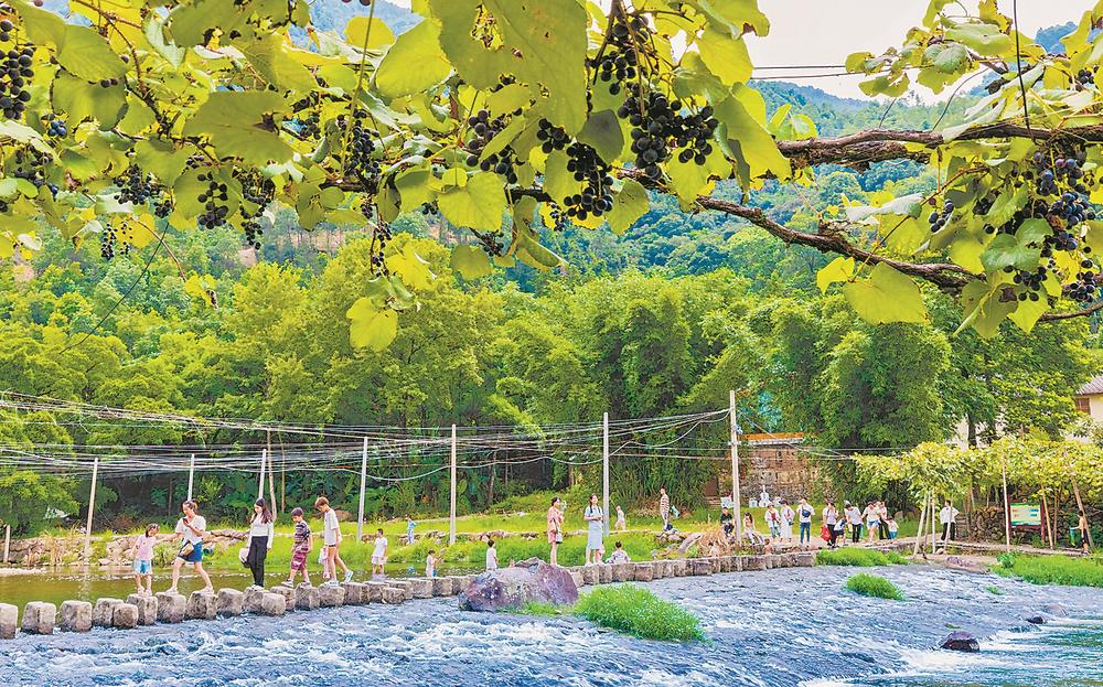 游客暢享親水之樂。 游客在溪水邊的刺葡萄藤下漫步。 東南網(wǎng)8月29日訊(福建日報報記者 單志強 通訊員 李郁 陳雅芳 攝影報道)藤上葡萄滿架,藤下溪水潺潺。初秋,位于福安市穆云畬族鄉(xiāng)溪塔村的“中國最美葡萄溝”內(nèi),綿延6公里的刺葡萄進入采摘季。作為福安本地“土著”品種葡萄,刺葡萄于上世紀六七十年代在溪塔村的秀溪兩岸溝澗中被大面積種植。目前,該村刺葡萄種植面積已達1200多畝,形成了年產(chǎn)值約1200萬元的地域特色果業(yè)。 每至初秋刺葡萄豐收,溪塔村都會吸引許多游客前來采摘,這里自然風光和畬鄉(xiāng)文化的美名也不脛而走。近年來,穆云畬族鄉(xiāng)加大旅游基礎配套設施投入,建設下坪魚鱗壩、沿溪夜景燈光、畬家酒坊、畬族文化館等,進一步吸引游客前來體驗畬鄉(xiāng)慢生活,刺葡萄等特色農(nóng)產(chǎn)品的銷路也更加通暢。 |