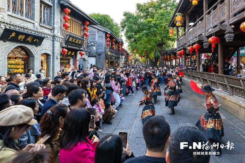 三坊七巷內(nèi)的沉浸式表演吸引許多游客駐足觀看。記者 林雙偉 攝 以文塑旅 旅途煥彩 金秋十月,第五屆煙臺山文化藝術(shù)季將整個煙臺山街區(qū)打造成開放式美術(shù)館,戶外裝置藝術(shù)與百年老建筑相得益彰?!八囆g(shù)已經(jīng)完全融入了街區(qū)的肌理!”來自上海的攝影師張先生一邊捕捉光影,一邊贊嘆道。國慶中秋假期里,煙臺山客流量達(dá)92.2萬人次,日均客流量超10萬人次,成為展現(xiàn)福州文藝氣質(zhì)的重要窗口。 “十四五”以來,福州通過場景、文化與體驗(yàn)的緊密結(jié)合,讓旅游不斷煥發(fā)出新的活力。從節(jié)慶旅游到非遺手作體驗(yàn),再到“為展赴城”(指因特定展覽活動而專程前往某城市)的新風(fēng)尚,富含文化底蘊(yùn)的旅游新業(yè)態(tài)持續(xù)“出圈”,精準(zhǔn)契合游客需求。 傳統(tǒng)非遺的創(chuàng)新演繹,更讓旅途有了深層文化共鳴。在福州評話伬藝傳習(xí)所劇場,互動式閩劇《三山舊夢》讓年輕游客曾凡眼前一亮:“沒想到閩劇能這么時尚!”該劇音樂總監(jiān)陳強(qiáng)帶領(lǐng)團(tuán)隊(duì)保留《茉莉花》《嘆四季》等傳統(tǒng)曲牌原有韻律,融入現(xiàn)代編曲手法,讓老戲迷能品出傳統(tǒng)韻味、新觀眾也覺悅耳動人。