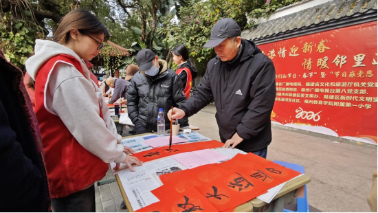 新春將至,年味漸濃。為傳承和弘揚中華優(yōu)秀傳統(tǒng)文化,讓社區(qū)居民在濃厚的文化氛圍中感受新春的溫暖與祝福,2026年1月29日,福建省文化和旅游廳機關黨委聯(lián)合福建省廣播電視局、福州市鼓樓區(qū)河東社區(qū)、福建民俗博物館、福州廣播電視臺第八黨支部、福州教育學院附屬第一小學共同開展“墨香濃情迎新春 情暖鄰里送祝?!薄?026年“我們的節(jié)日·春節(jié)”暨“節(jié)日感黨恩 共話新時代”主題活動。轄區(qū)居民、企業(yè)人才代表、市民代表、轄區(qū)臺胞等共同參加。