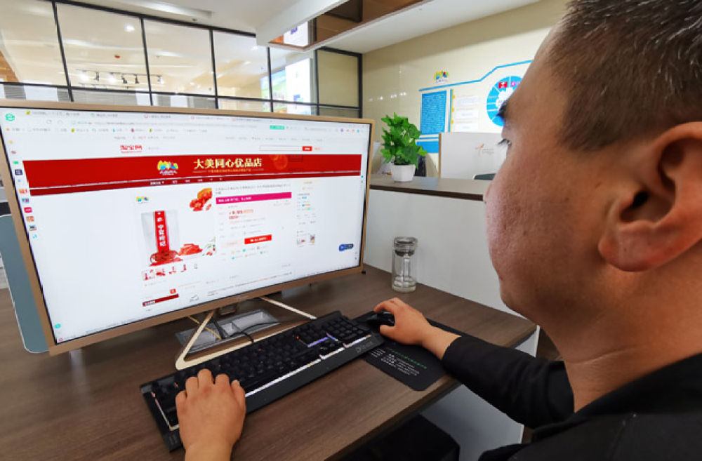 工作人員正在通過淘寶網(wǎng)大美同心優(yōu)品店銷售特色農(nóng)產(chǎn)品。新華社記者 盧鷹 攝