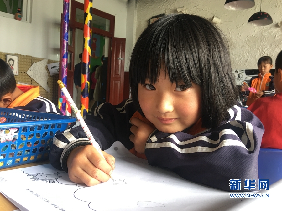 甘肅省臨夏縣思明幼兒園里,一名孩子正在畫(huà)畫(huà),臉上的笑容羞澀而純真。新華網(wǎng) 程立葳 攝