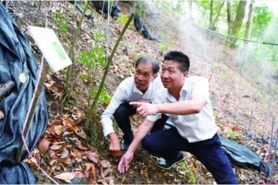 在仿野生金線蓮種植基地內(nèi),孫紹勝正和種植戶查看植株長(zhǎng)勢(shì)。 福建日?qǐng)?bào) 攝
