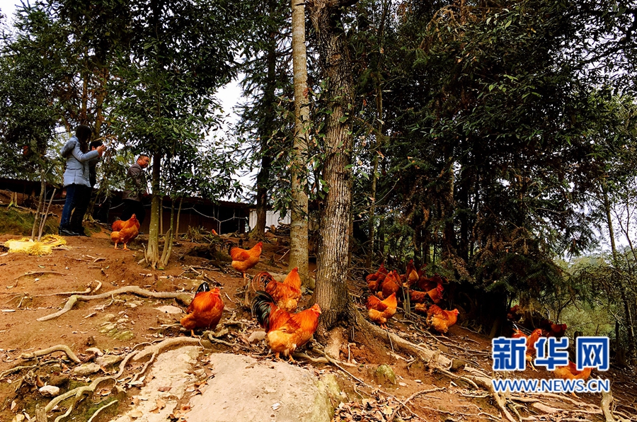 1月21日,在福建省長(zhǎng)汀縣古城鎮(zhèn)元口村,縣農(nóng)業(yè)局下屬企業(yè)遠(yuǎn)山河田雞公司董事長(zhǎng)邱其華(右)查看農(nóng)民林木生在山林間散養(yǎng)的河田雞。新華社記者魏培全攝