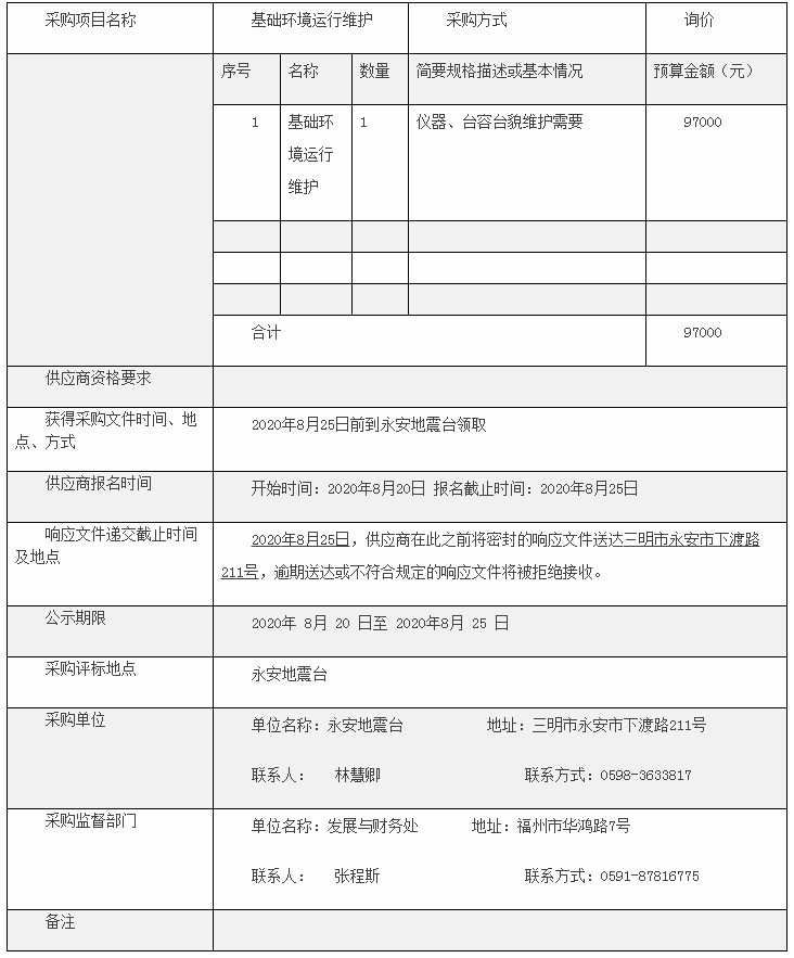 永安地震臺基礎(chǔ)環(huán)境運行維護(hù)合同采購公告