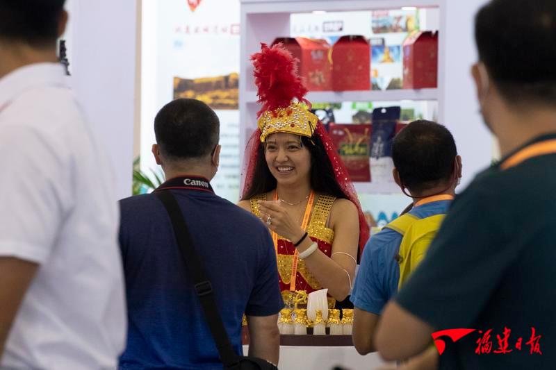 新疆昌吉州展區(qū),身著民族服飾的姑娘向來(lái)賓介紹昌吉州特色產(chǎn)品。(福建日?qǐng)?bào)記者王毅攝影報(bào)道)