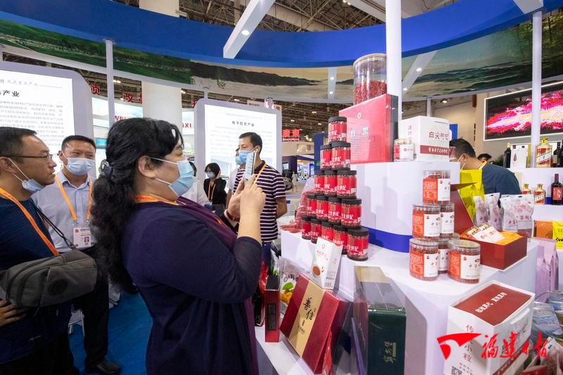 寧夏展區(qū),客商在特色農(nóng)產(chǎn)品前拍攝并問(wèn)詢(xún)商品情況。(福建日?qǐng)?bào)記者王毅攝影報(bào)道) |
