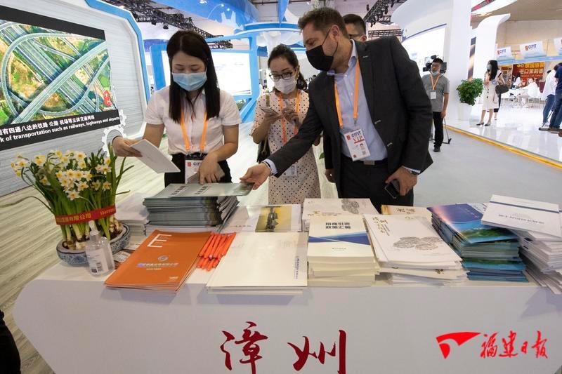 一位外籍客商在漳州展區(qū)領(lǐng)取相關(guān)投資介紹。(福建日?qǐng)?bào)記者王毅攝影報(bào)道)