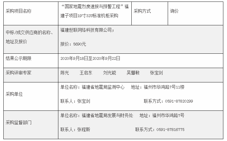 監(jiān)測中心國家地震烈度速報與預(yù)警工程福建子項目標(biāo)準(zhǔn)機柜采購結(jié)果公示