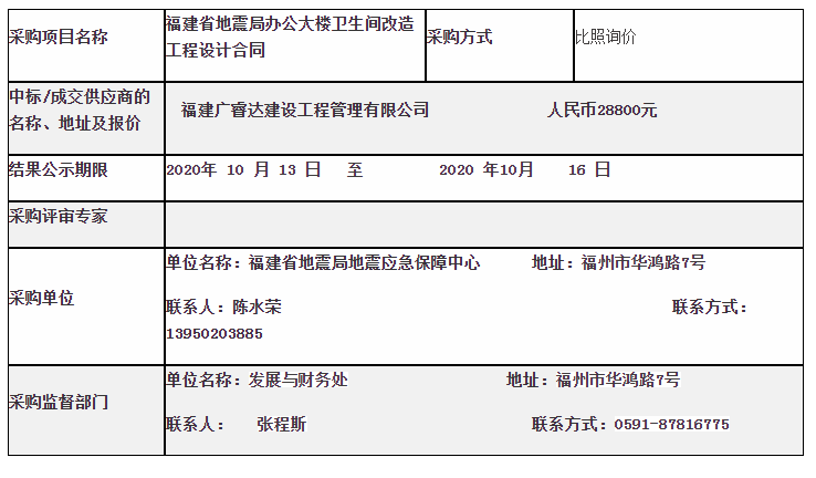 福建省地震局辦公大樓衛(wèi)生間改造工程設計采購結果公告